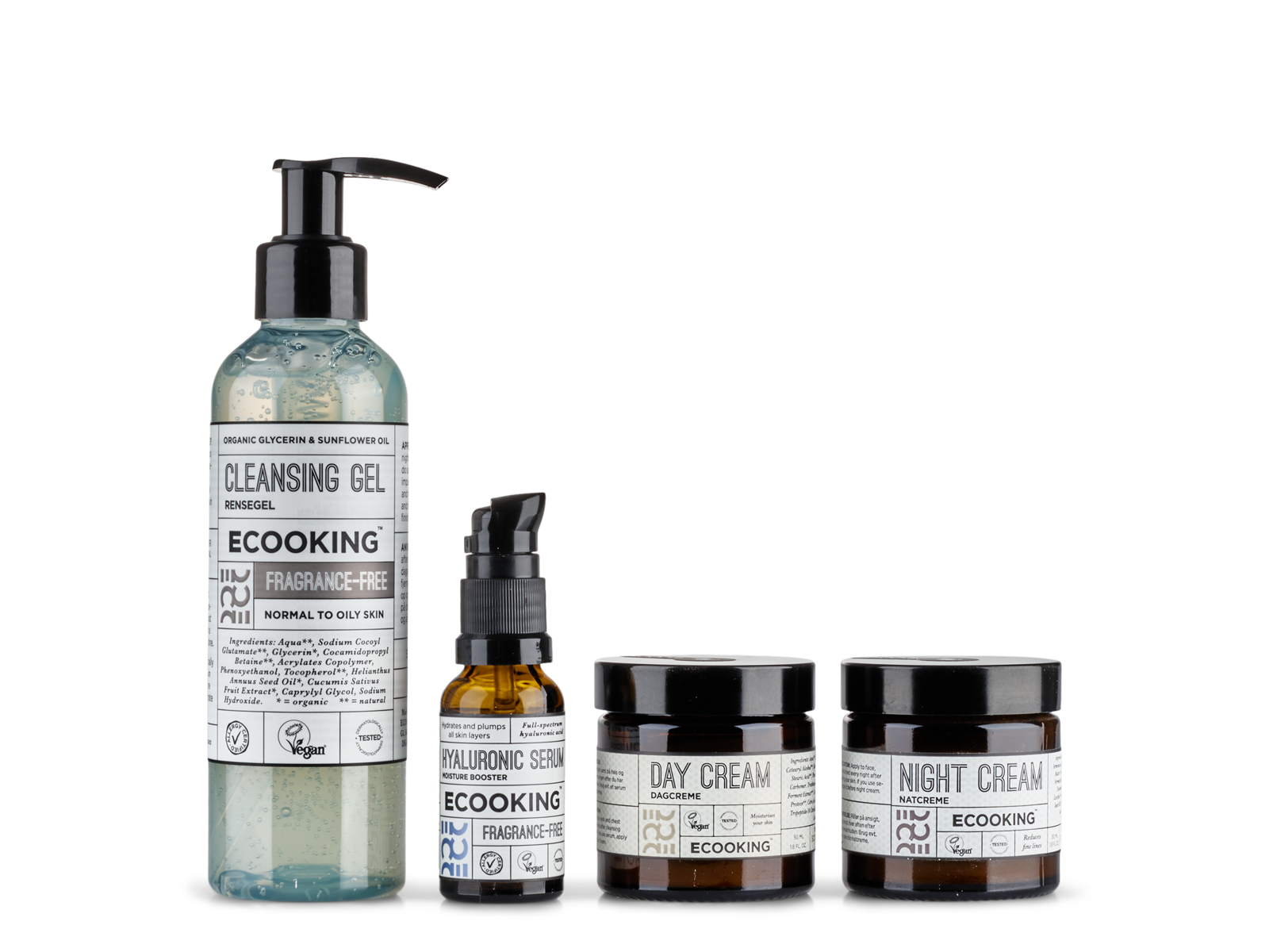 En komplet rutine, der renser og fugtforkæler huden morgen og aften. Hyaluronic Serum tilfører dyb fugt og fylde i alle hudlag. Sættet er AllergyCertified, parfumefri, vegansk og dermatologisk testet.
