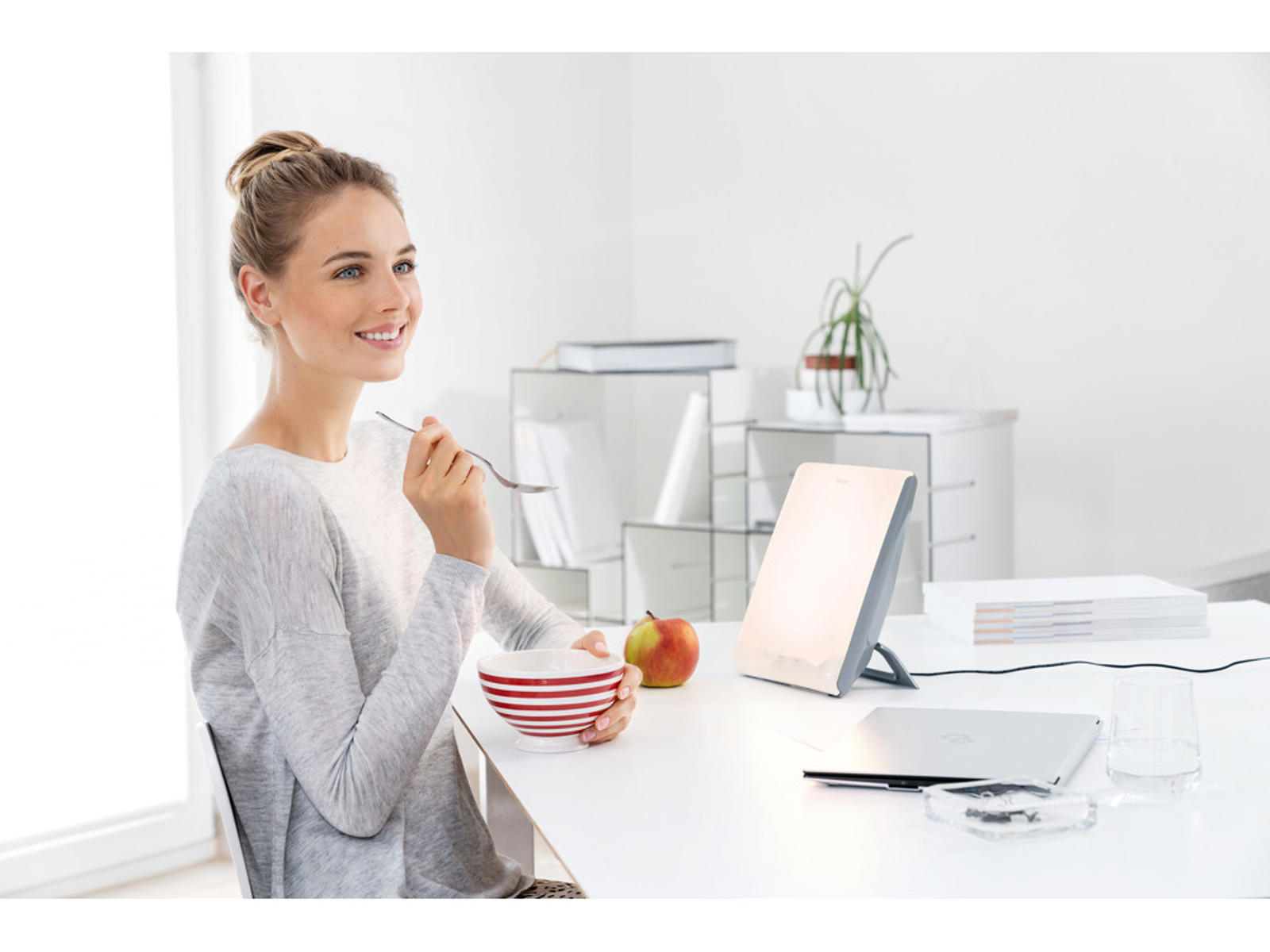 Lysterapilampen efterligner det naturlige lys i løbet af en dag. Lampen giver dig mulighed for at understøtte de forskellige arbejds- og hvilefaser på en arbejdsdag: terapi, koncentration og afslapning. For en reguleret døgnrytme.