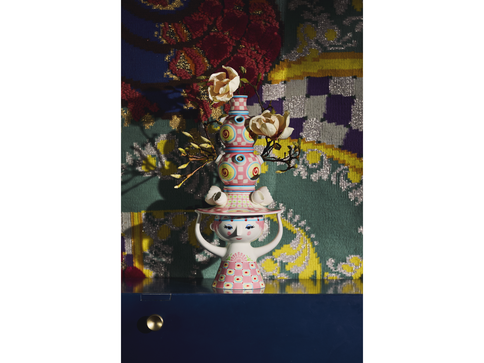 Han designede selvfølgelig ikke små uanseelige pyntehatte. Nej, det var store voluminøse kreationer, der var både skulpturelle og avantgarde i deres udtryk – præcis som i serien Lady with hat. Og Bjørn Wiinblads univers bliver nok heller ikke meget mere magisk, fantasifuldt, fantastisk og overdådigt, end det er tilfældet med denne helt spektakulære vase i glaseret keramik. Den omfavner til fulde alt, hvad der er skørt, skævt, kreativt og vidunderligt i Bjørn Wiinblads verden. Vasen måler intet mindre end 50 cm i højden og er hånddekoreret fra top til tå med motiver inspireret af Bjørn Wiinblads mangfoldige arkiv. Og det er ikke bare én vase. Vasen består af to individuelle vaser, der både fungerer sammen og kan stå alene. Vasens base prydes af det ikoniske ansigt med den trekantede næse, de mandelformede øjne, rosenrøde kinder og det finurlige smil på læben.