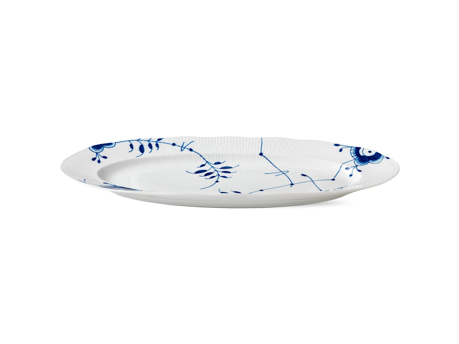Da dette smukke fad blev designet i 1890, var det oprindeligt tænkt som et fiskefad. I dag er det op til fri fortolkning, hvordan det smukke Blå Mega Riflet Fad på 60 cm bruges, men de forstørrede, håndmalede elementer ophøjer ethvert øjeblik til noget helt særligt. Blå Mega Riflet er på en gang velkendt og forfriskende. Stellet er født af en modig nyfortolkning af det ikoniske Musselmalet Riflet og fortryller med sine grafiske og forstørrede sektioner af det musselmalede mønster. Siden Blå Mega Riflet blev designet i 2000 er stellet vokset sig til en ny klassiker inden for dansk design, og det iøjnefaldende stel er smukt i sig selv og i kombination med andre Royal Copenhagen stel.