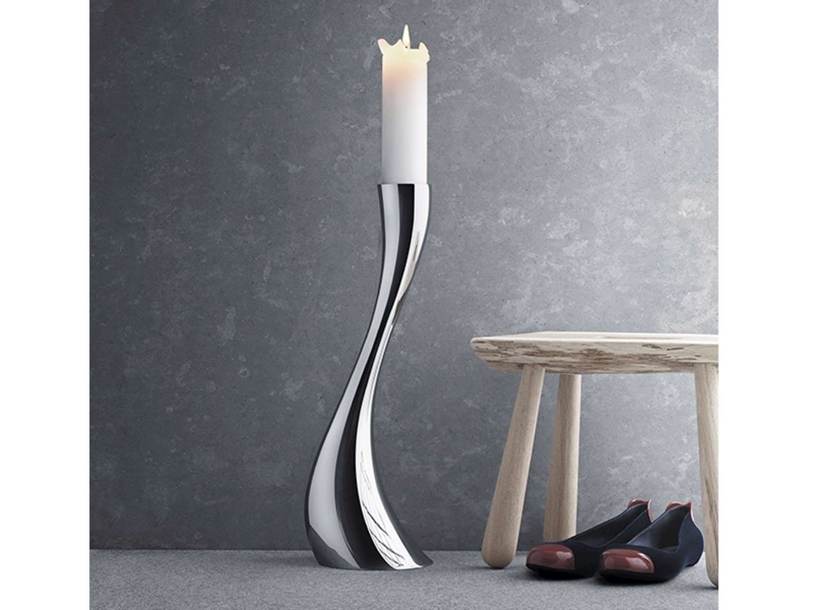 I takt med at Georg Jensen har haft voksende success med Cobra serien, er seien også vokset. Den klassiske Cobra lysestage kommer nu i en større gulvstage udgave til bloklys. Cobra gulvstagen er yderst dekorativ og kan med fordel sættes sammen med deøvrige størrelser i serien. Lysestagen er af blankt rustfrit stål og måler H500 mm. Designet af Constantin Wortmann.