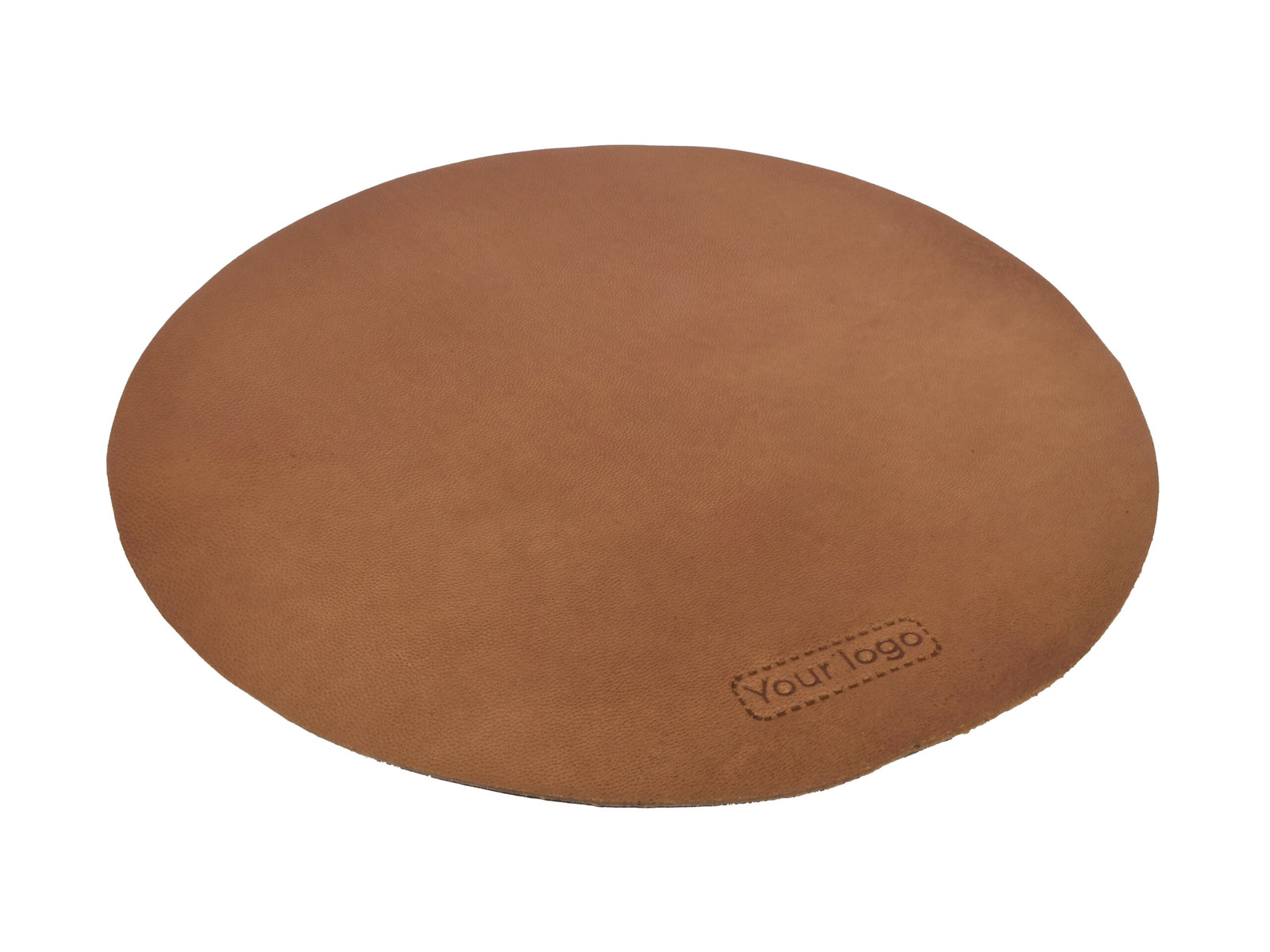 Rund musemåtte i vegetabilsk garvet læder med Jeres logo præget i læderet