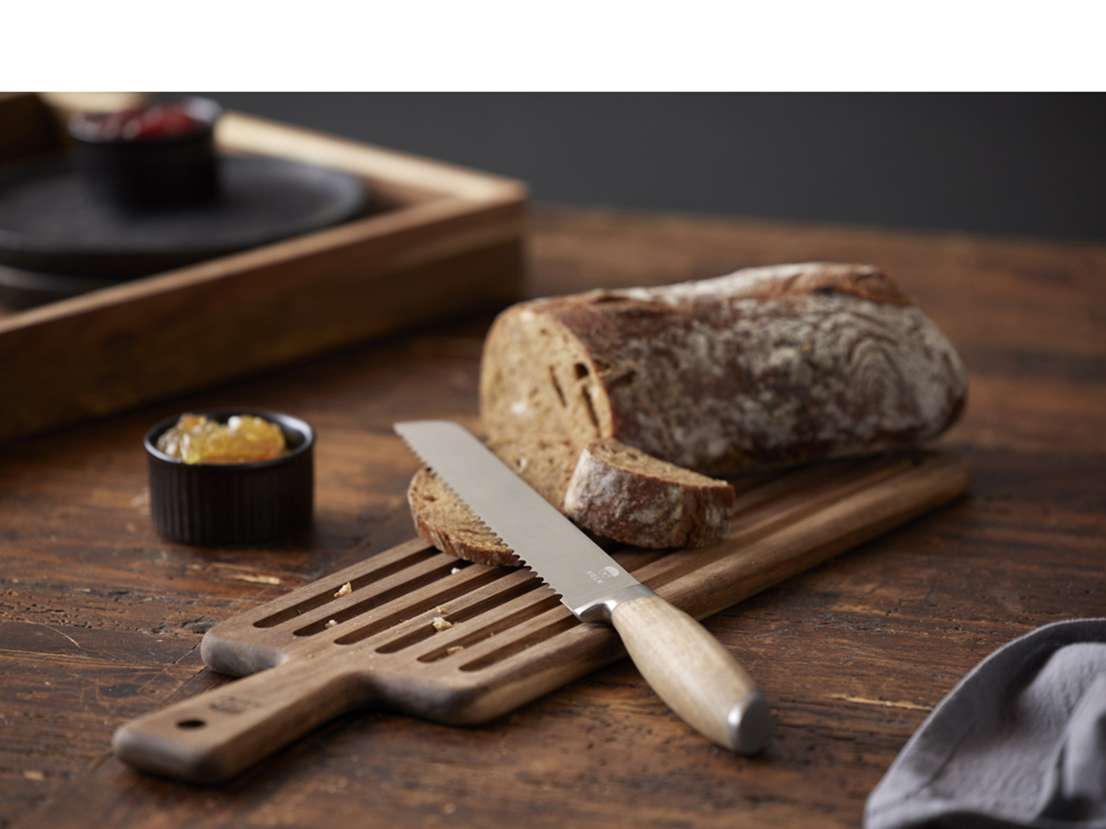 Det fine brødsæt består af et stort skærebræt af smukt akacietræ, 46 x 13,8 x 1,5 cm, og en savtakket brødkniv i rustfrit stål og akacietræ. Knivens runde håndtag ligger godt i hånden, og skærebrættet har riller, der opsamler brødkrummerne.