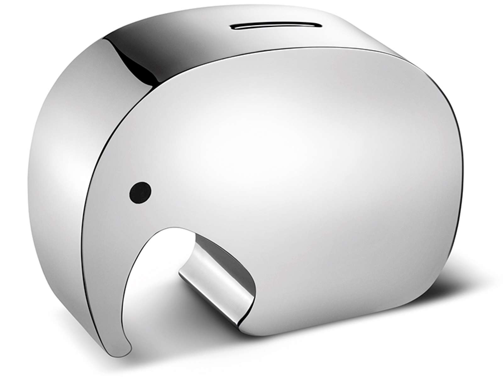 Sød og elegant sparebøsse til småmønter. Moneyphanten er en af efterfølgerne til Georg Jensen Øllefanten, som Jørgen Møller designede i 1987. Mål: H 126mm, B 60mm, L 173mm.