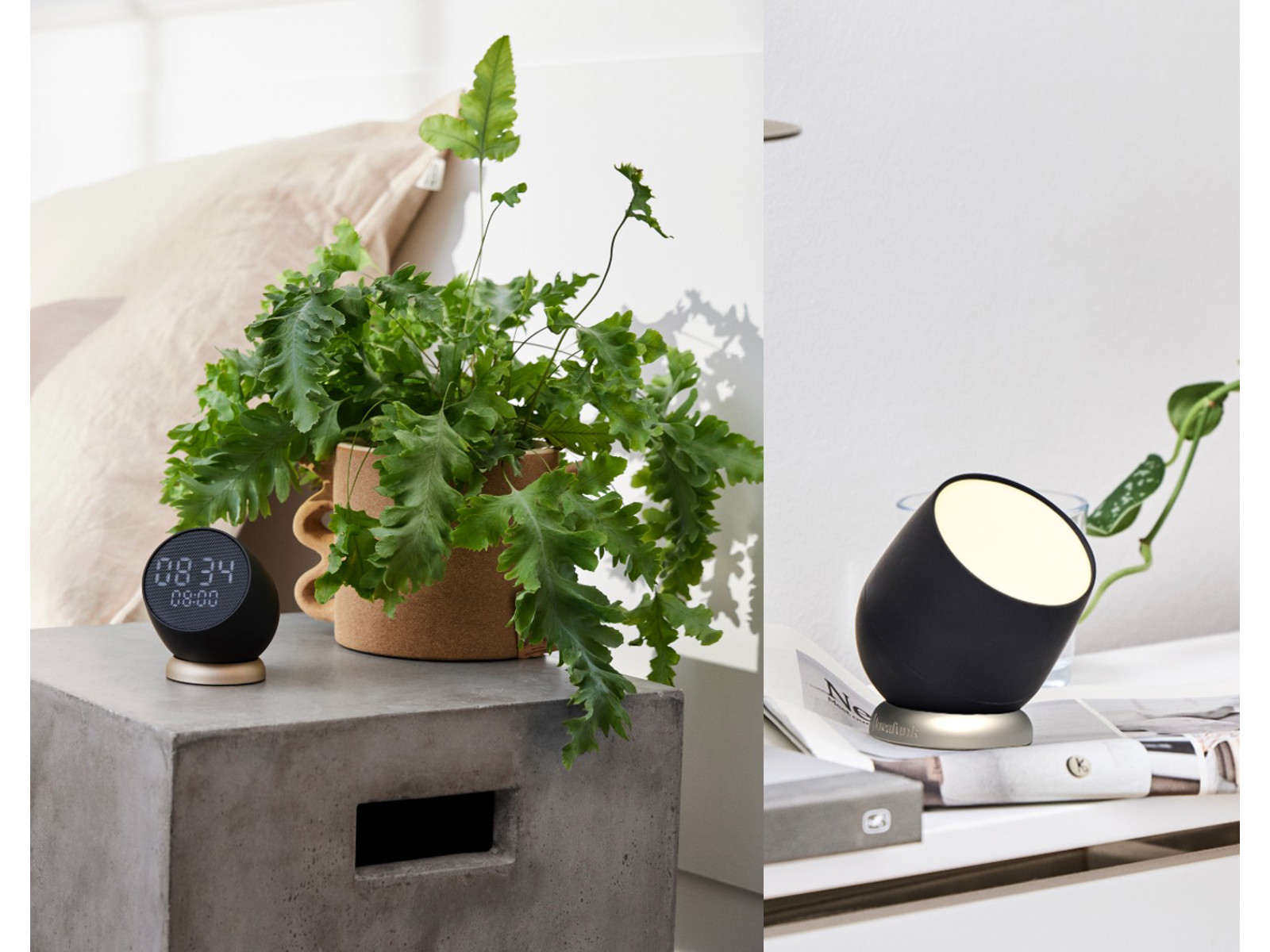 Bell: Bell er en alarmklokke, der er designet til at gøre dine morgener lysere og mere energiske. Med sit stilfulde og intuitive design har det aldrig været mere afslappende at vågne op. For at slukke alarmen skal du trykke på knappen, og for at snooze løftes den op og vendes på hovedet. Det betyder, at du slipper for at famle rundt i mørket eller kæmpe for at finde snooze-knappen. Bell har desuden et trådløst design for ekstra bekvemmelighed. Sig farvel til sammenfiltrede ledninger og begrænset mobilitet og placér den, hvor det passer dig bedst. Displayet tændes ved berøring og forbliver derefter tændt i 4 minutter, hvorefter det slukkes, så det ikke forstyrrer din nattesøvn.Omfavn enkelheden og gør hver morgen til en leg med Bell.