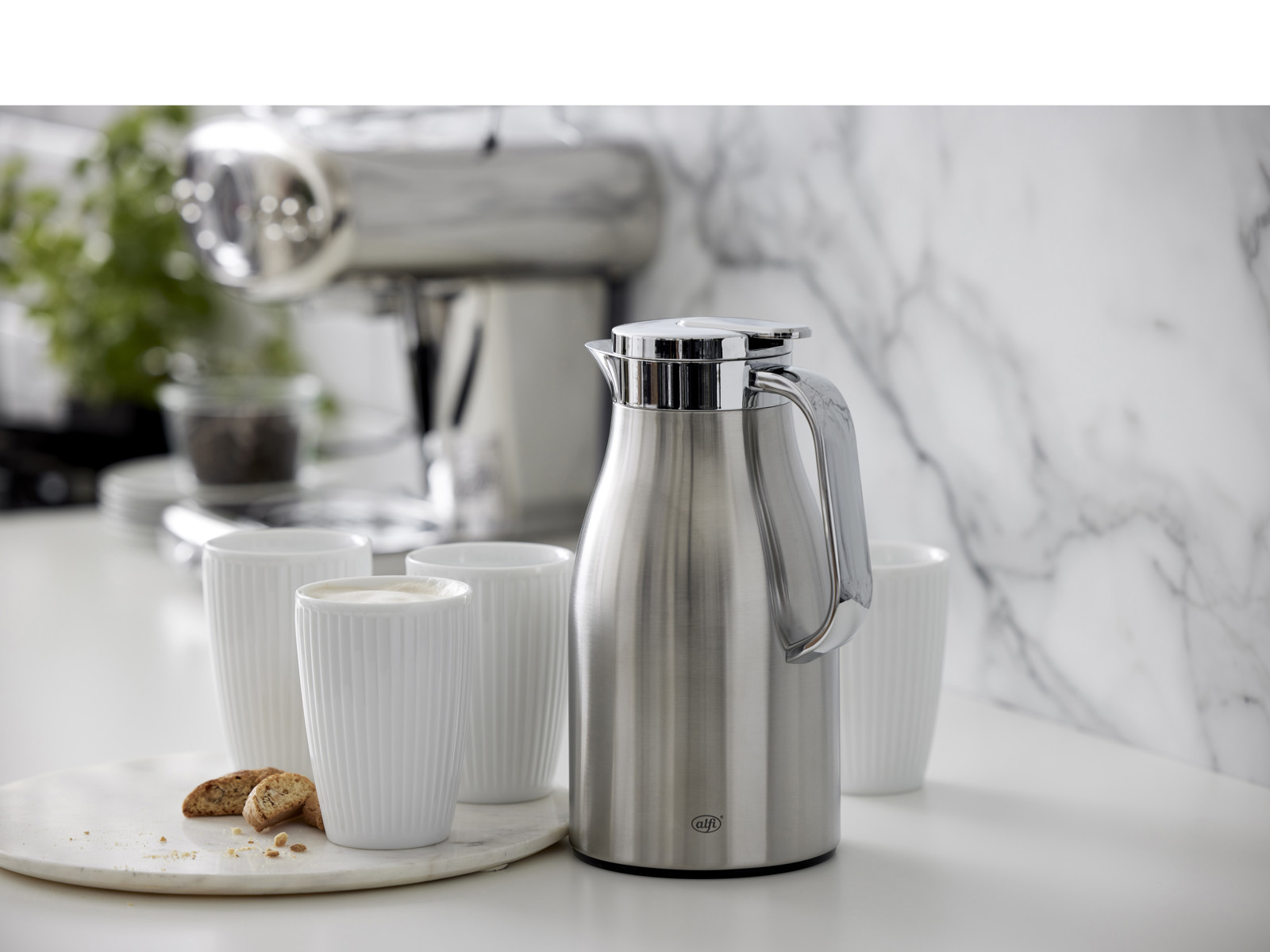 Alfi Skyline kombinerer cool stil med høj funktionalitet i køkkenet og på kaffebordet. Termokande i rustfrit stål i høj kvalitet. Dobbeltvægget AlfiDur-indsats i isolerende og hærdet vakuum-glas. Holder varmt i op til 12 timer og koldt i op til 24 timer. AromaSafe-princippet bevarer kaffens runde smag. Unikt og praktisk hældesystem. Kan betjenes med én hånd. Ergonomisk, forkromet metalhåndtag. Fri for BPA. Designet af PEARL CREATIVE.