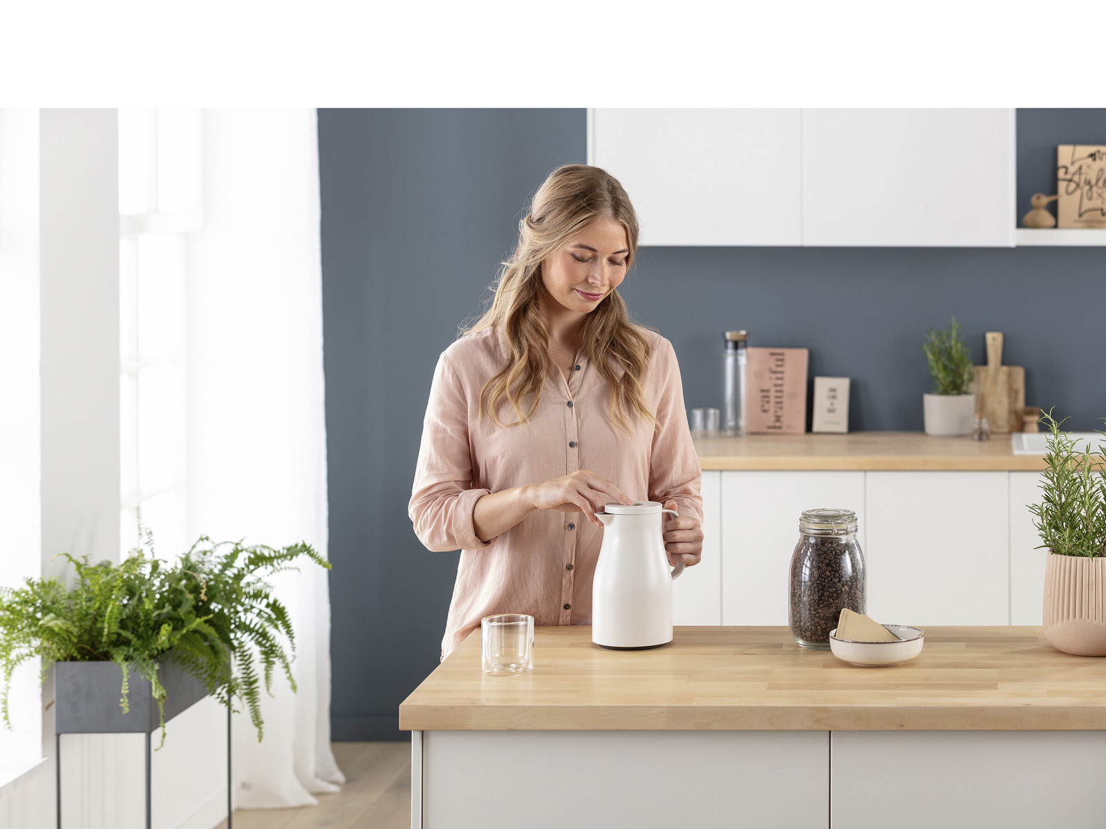 Alfi Econscious kombinerer funktionalitet med elegant design. Med en kapacitet på 1 liter holder termokanden dine drikkevarer varme i op til 12 timer og kolde i op til 24 timer. Termokanden er udstyret med en indsats af hærdet glas, et lækagesikkert skruelåg og et ergonomisk håndtag, hvilket gør den let at bruge. Den er fremstillet af 94 % bioplast, lavet af biopolymerer, som stammer fra rester af sukkerrørspresning. Det er resterne fra trin 3-5 i processen, hvor materialet, der ikke kan anvendes til fødevarer, omdannes til bioplast. Designet af PEARL CREATIVE.