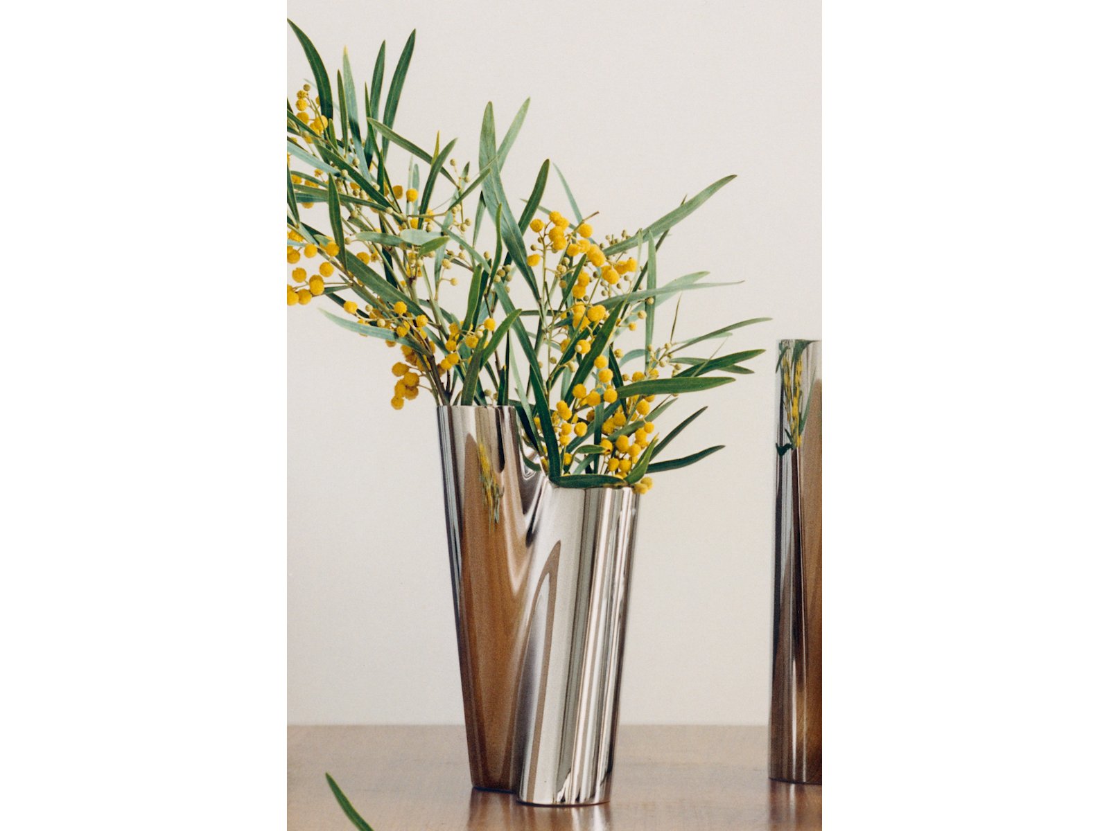 Denne skulpturelle vase er designet af den danske arkitekt og designer Anne Boysen. Vasen er fremstillet i håndpoleret rustfrit stål og har en elegant form i forskellige højder og vinkler, som indbyder til at arrangere blomsterne på kreative måder. Boysens vision var at designe en vase, der støtter blomsten i hele dens levetid. Uanset hvordan blomsterne arrangeres, sørger vasens form for, at det også ser smukt ud, når blomsterne ændrer sig med tiden. H22,8