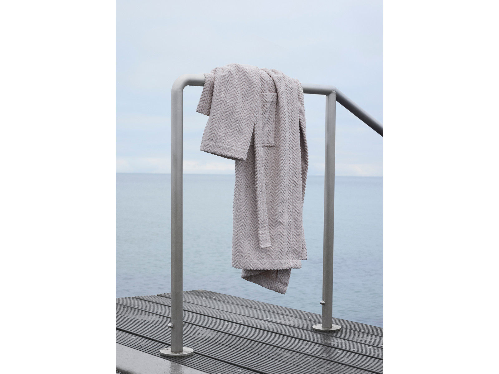 Badekåbe med stringent herringbonemønster i blød frotté. Unisexdesignet er klassisk og enkelt med bindebånd i taljen og lommer. Det er den særlige jaquardvævning, der gør det muligt at skabe det elegante sildebensmønster. Kvaliteten i 100 % bomuld med løkker i dobbelttvundne og kæmmede garner giver et ensartet og glansfuldt udtryk. Badekåben er Oeko-Tex® certificeret.