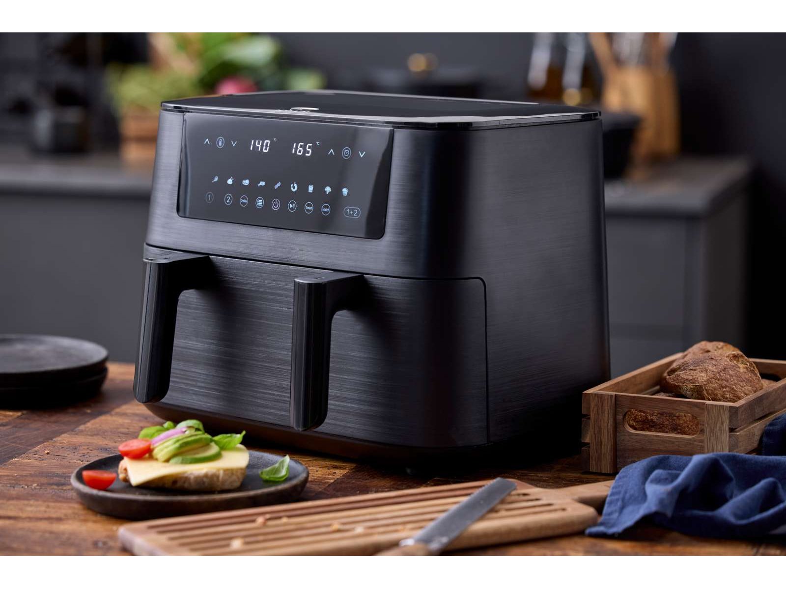Dobbelt airfryer med en skuffe med rumdeler, så du kan bruge den som en enkelt stor skuffe eller to lige store skuffer. Det vil sige, at du kan tilberede dobbelt portion eller to forskellige retter samtidig, ligesom temperaturkontrol og timer kan indstilles separat. 9 forudindstillede programmer, temperaturregulering fra 80 til 200 °C samt timer. Skuffen har praktisk nonstick-belægning, som sikrer nem rengøring. Denne airfryer er også udstyret med et digitalt display, auto-sluk og overophedningsbeskyttelse. 2800 watt.