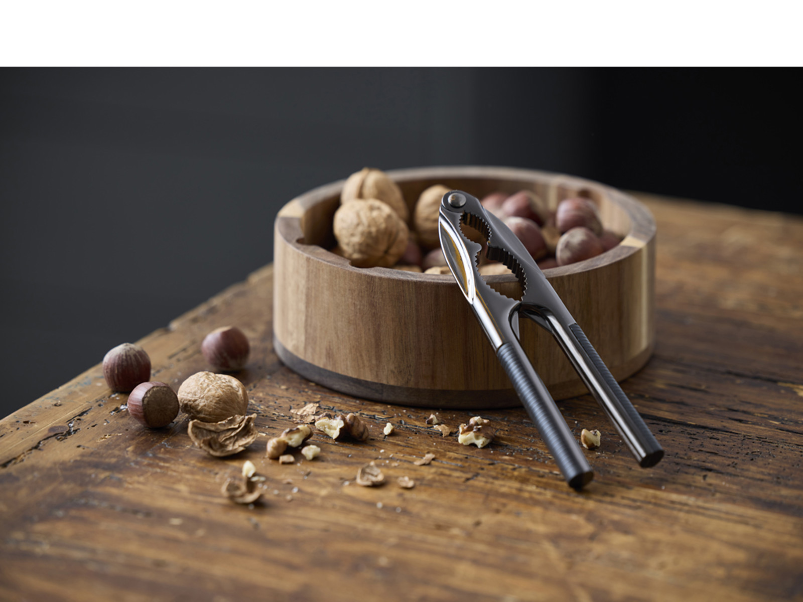 Nøddeknækkersæt med rund skål af akacietræ, dia. 17 cm, og nøddeknækker i metal med sort greb. Nøddeknækkerens hoved og håndtag passer ned i de små fordybninger på skålens kant, så den altid kan ligge klar til at knække nødder. Læg aldrig akacietræ i blød. Vaskes med varmt vand og mild sæbe. Tåler ikke opvaskemaskine. Kan med fordel efterbehandles med madolie et par gange om året.