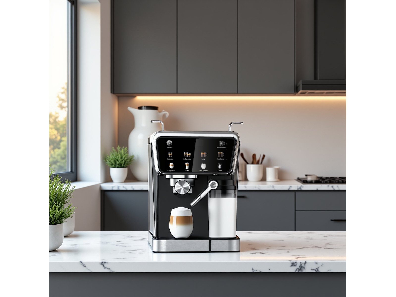Med Hâws Espressomaskine 7-i-1 får du caféoplevelsen direkte i dit køkken. Maskinen kombinerer professionelt 20-bar tryk, justerbar mælkeskumning og et intuitivt touchpanel, så du kan brygge alt fra intens espresso til cremet cappuccino med ét tryk.Den store vandtank, integrerede mælkebeholder og