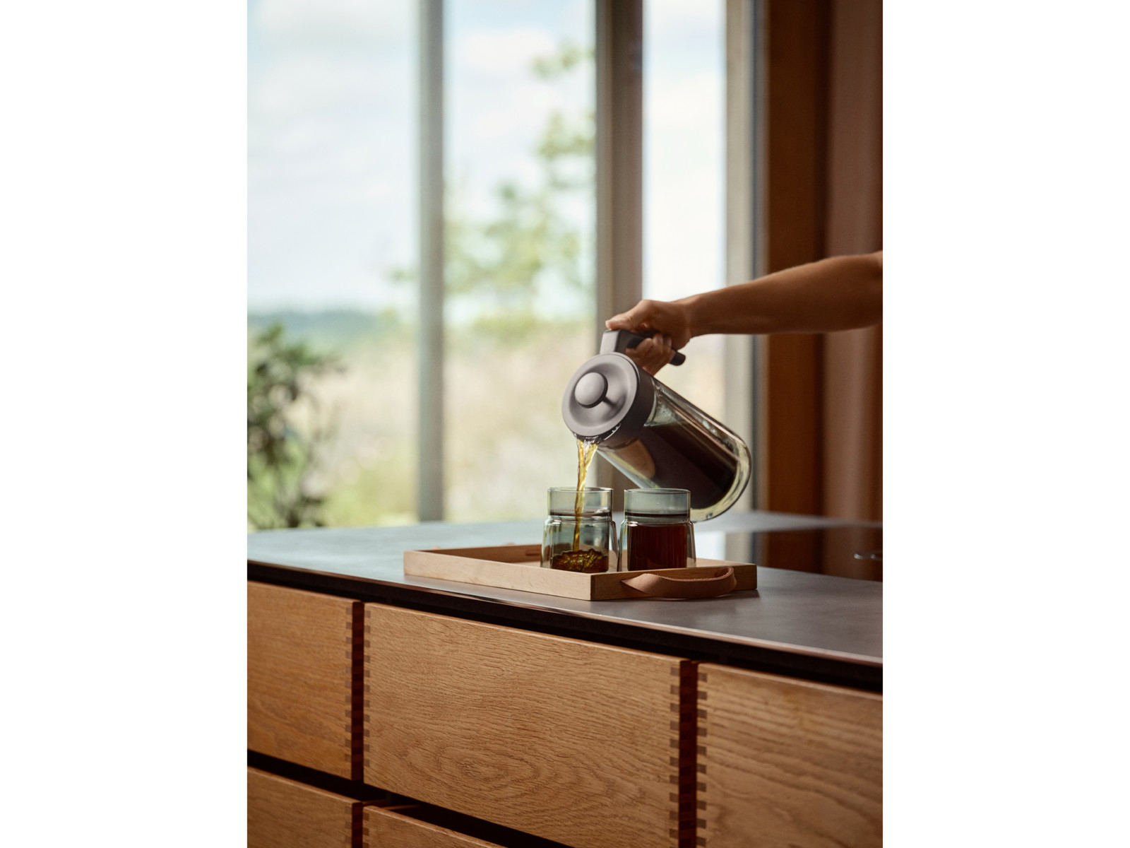 Jacob Jensen Coffee Press med CoffeeCatcher™ gør din daglige kafferutine enklere. I stedet for at efterlade den brugte kaffegrums i bunden af din Coffee Press samles grumset oven på CoffeeCatcher™. Dette gør det nemt at fjerne grumset og efterlader Coffee Press ren og klar til næste brygning. Den dobbeltvæggede konstruktion sørger for, at kaffen holder den perfekte temperatur og beskytter dine hænder mod varmen fra glasset. Coffee Pressen rummer 6 til 8 kopper.