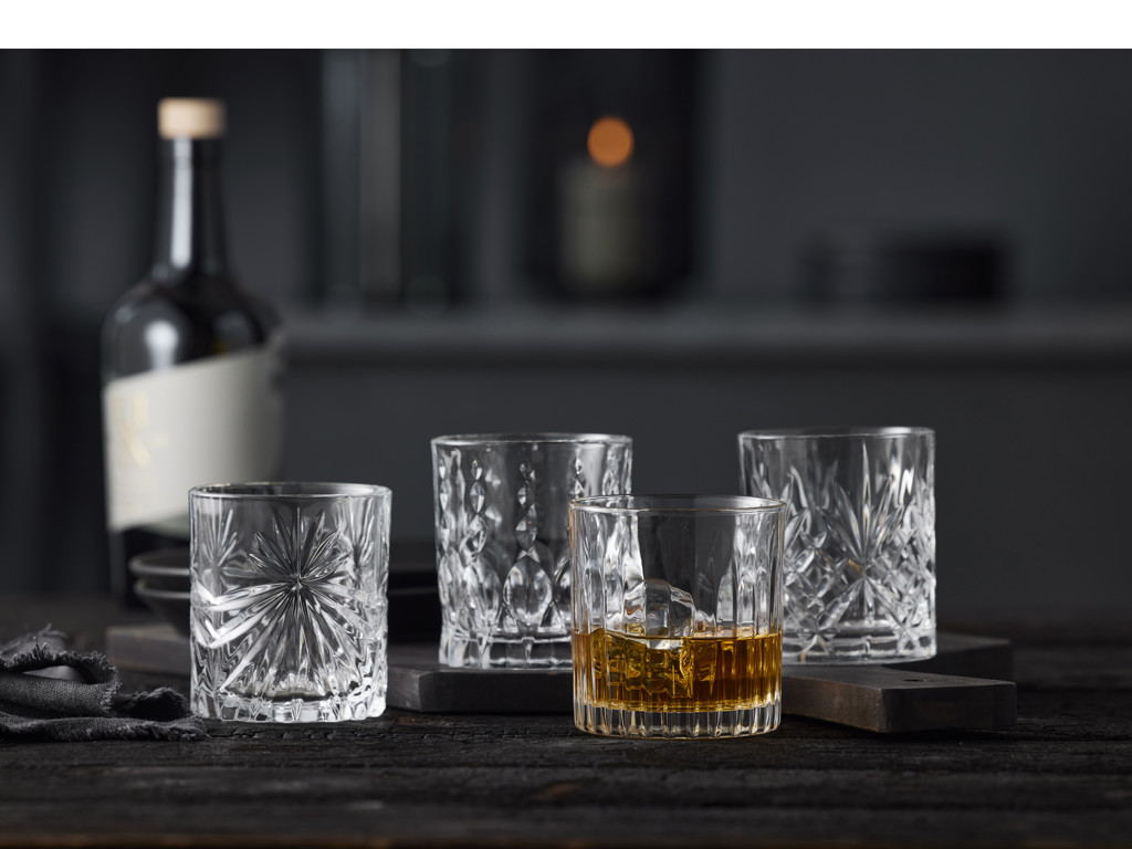 4 stk. whiskyglas, 30 cl, i fire forskellige mønstre: Melodia, Timeless, Oasis og Marilyn. Vær den perfekte vært og forkæl dine gæster med udsøgte drikkevarer i elegante glas med smukke mønstre, der fremhæver drikkens farvenuancer. Tåler opvaskemaskine.