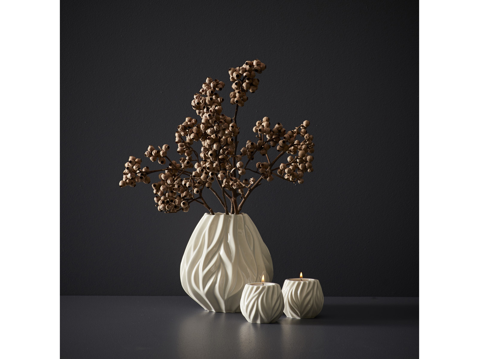 Flame vase, 19 cm høj, samt et sæt af to Flame fyrfadsstager i samme skulpturelle design som vasen, alle dele i porcelæn med en smuk hvid glasur. Vasens og stagernes organiske mønster leder tankerne hen på ild og flammer.
