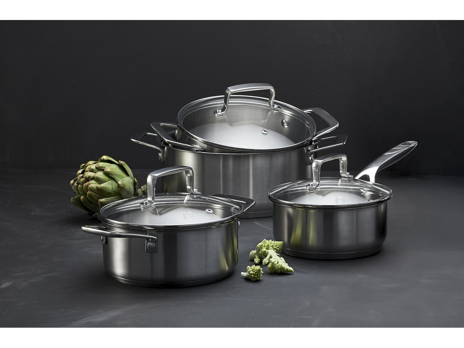 Grydesæt med låg, 8 dele. 79NORD-gryderne er fremstillet i 18/8 rustfrit stål med en bundtykkelse på 4,5 mm og har glaslåg med damphul.