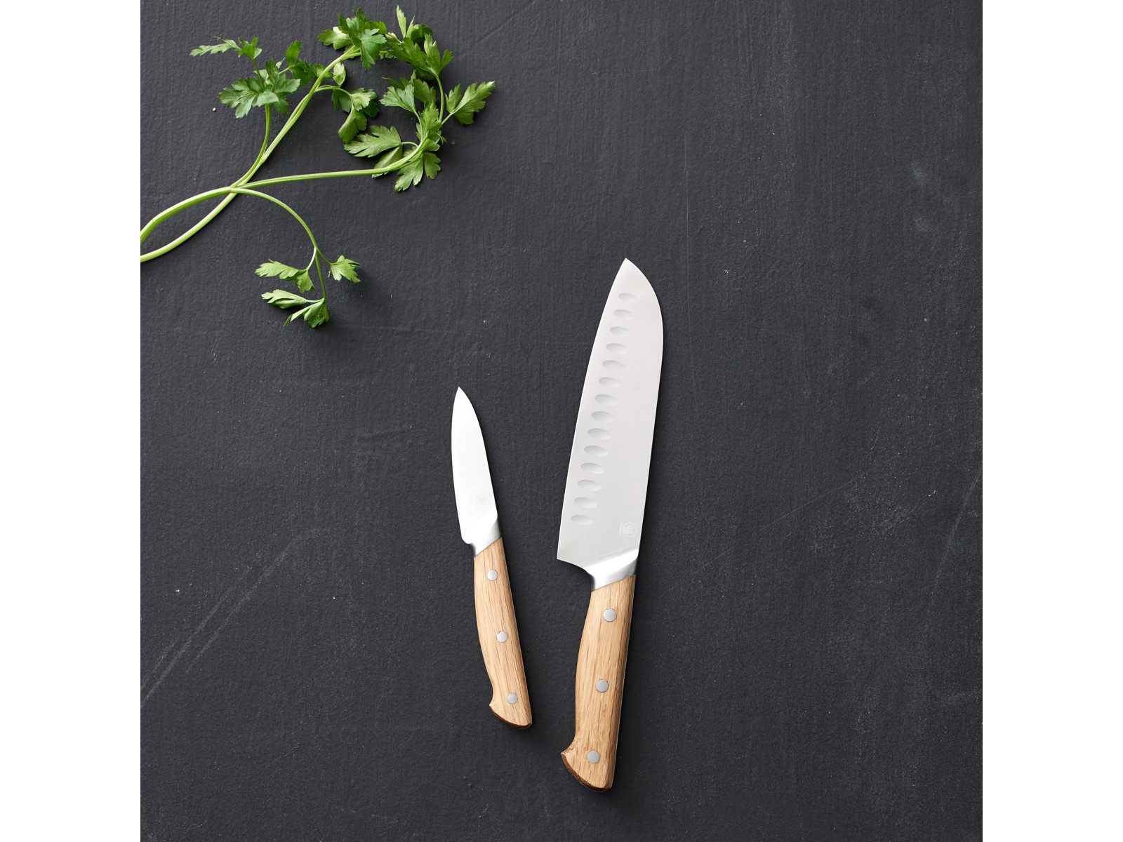 Knivsættet med santokukniv og urtekniv er det perfekte, alsidige makkerpar til køkkenet. Knivbladene er udført i rustfrit kvalitetsstål og håndtagene i olieret eg, som ved brug vil udvikle patina og blot blive smukkere, jo mere knivene bruges. Træhåndtagene er udformet af ét stykke træ og er behagelige at holde om. Santokuknivens blad er designet med luftskær, der sørger for, at det afskårne ikke sætter sig fast på bladet.