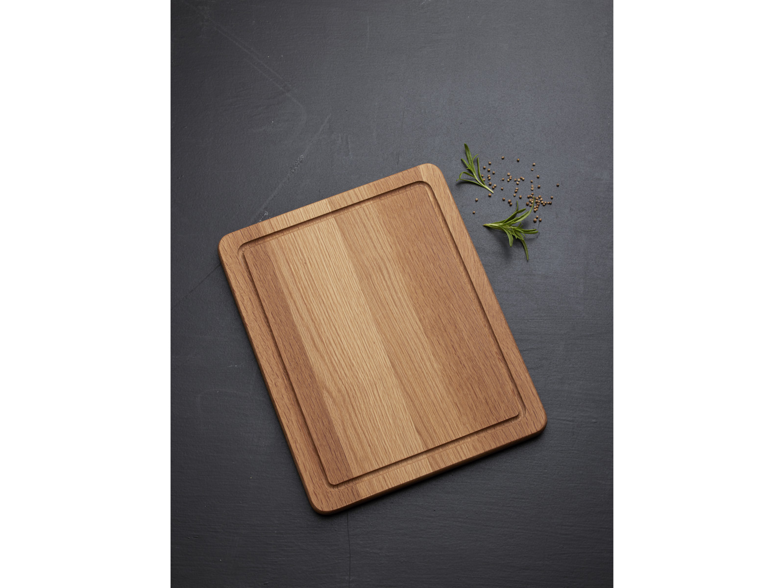 Det smukke og solide skærebræt er fremstillet af olieret eg og har mange anvendelsesmuligheder. Den ene side af skærebrættet er udstyret med en saftrille, der opsamler saft bl.a. fra kød, og den anden side er glat. Begge sider kan anvendes til udskæring og servering.