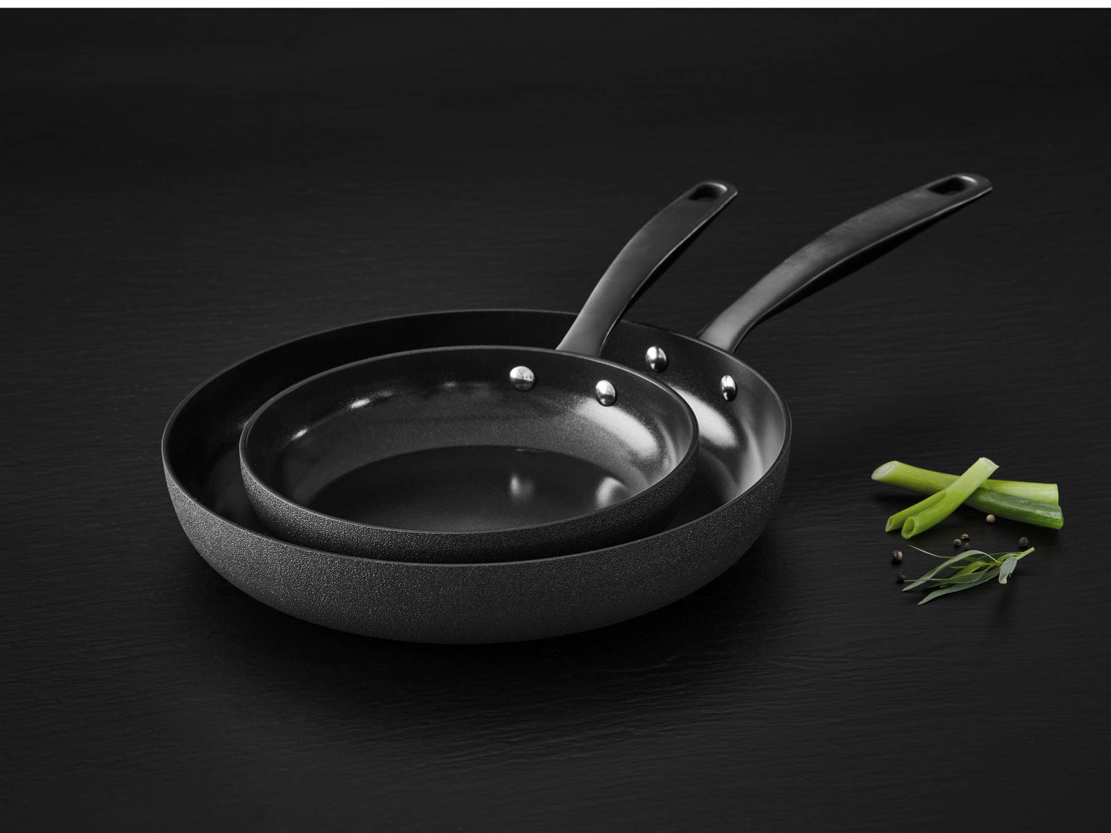 Produkternes elegante konstruktion med lodrette sider og en afrundet overgang mellem sider og bund udnytter formen effektivt og giver panderne en stor stegeflade.