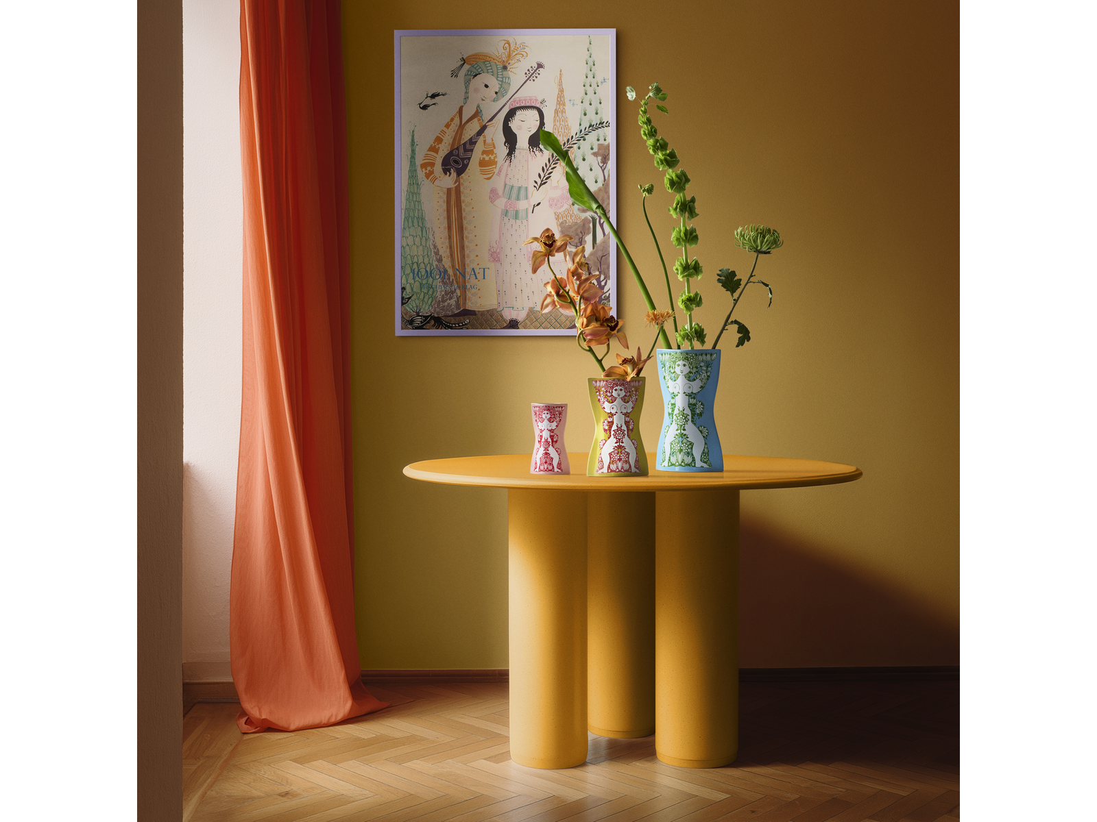 Et visuelt kraftfelt baseret på originalt artwork, der løfter rummet – og humøret. Nina er ikke en klassisk vase. Det er kunst i brugbar form skabt med inspiration i Bjørn Wiinblads imponerende designarkiv, der fortolker en kvindefigur med stærk grafisk identitet og skulpturel silhuet – dekoreret med farverig, blomstrende botanik i ophøjede decals, der både kan ses og mærkes. Det er Bjørn Wiinblad, når han er modigst. Og mest poetisk. De kurvede former og sensuelle detaljer står som et kreativt modsvar til minimalismen – med et udtryk, der emmer af liv, leg, styrke og stolthed.