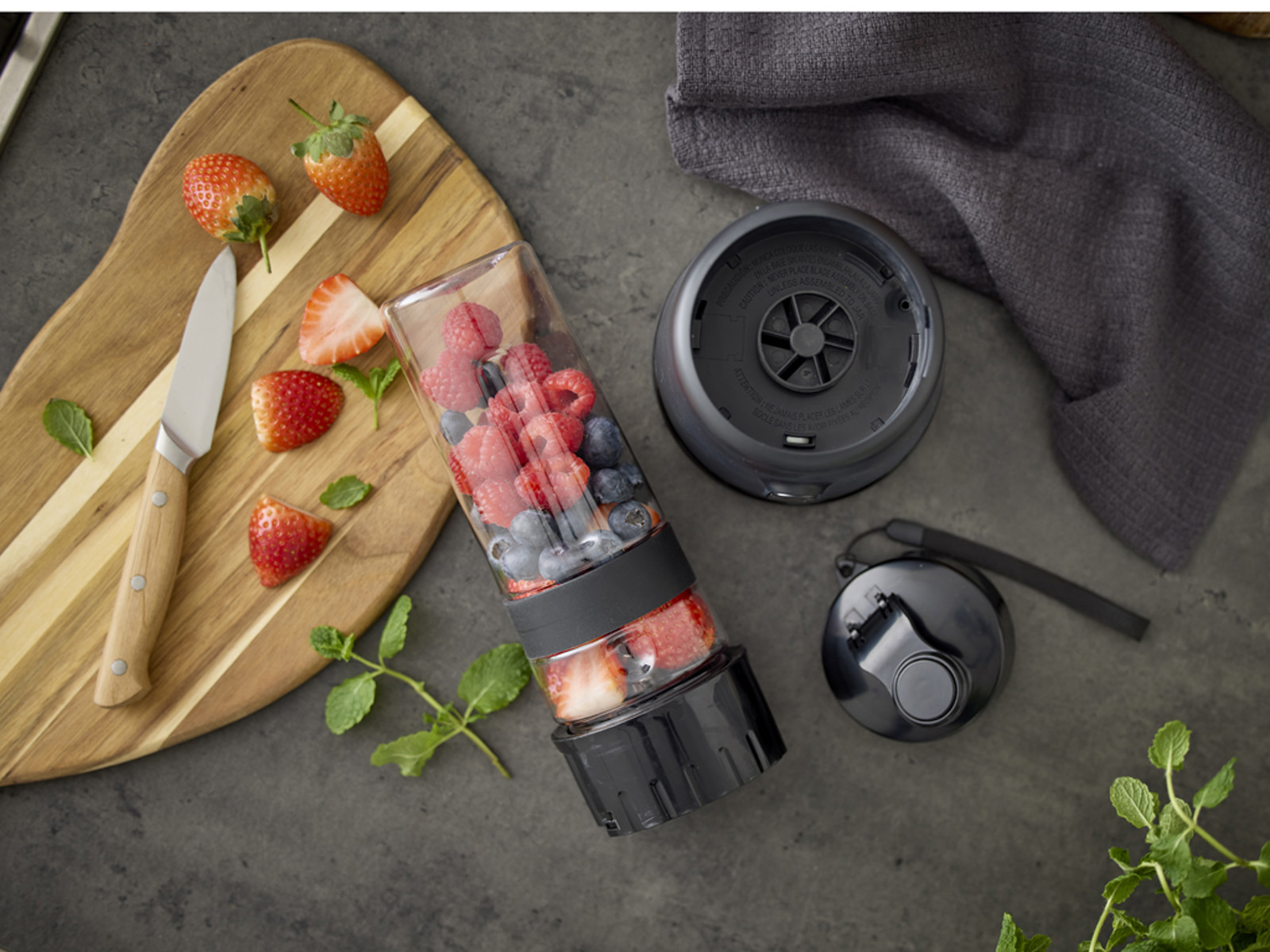 Smoothieblenderen er til dig, som gerne vil have friske smoothies med på farten. Blenderen er udstyret med en 300 watt motor og fire skarpe knivblade i rustfrit stål, som blender frugt og grøntsager til en jævn og cremet konsistens. Der medfølger en 600 ml drikkeflaske med låg, som passer perfekt på blenderen, så du kan blende din smoothie direkte i flasken. Der er mulighed for ledningsoprul i bunden af blenderen.