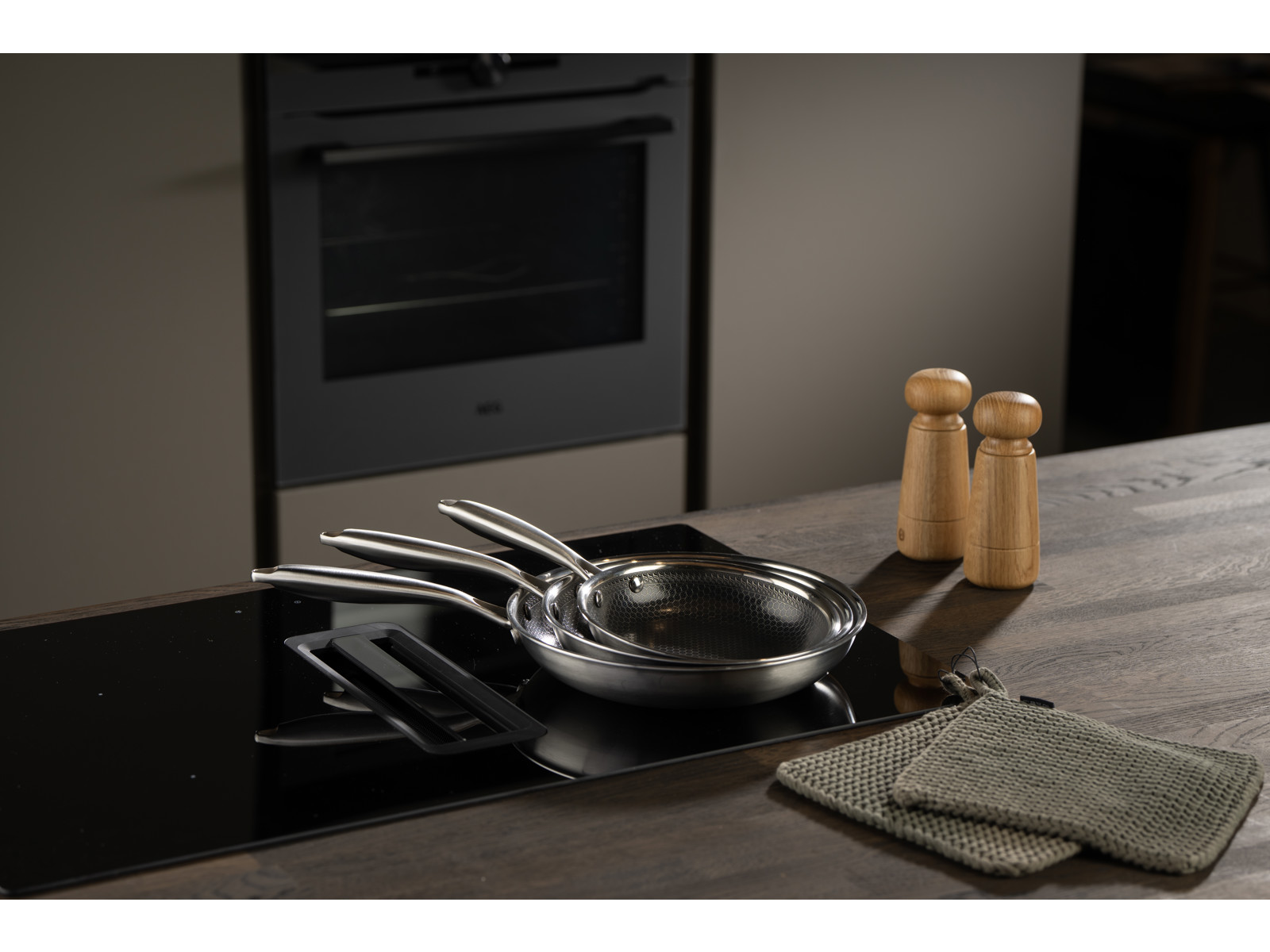 Dette Hybrid pannesæt i tre størrelser, 20 cm, 24 cm og 28 cm, giver alsidighed til enhver madlavning. Fremstillet i mat rustfrit stål med en tykkelse på 2.5 mm, sikrer de holdbarhed og jævn varmefordeling.
