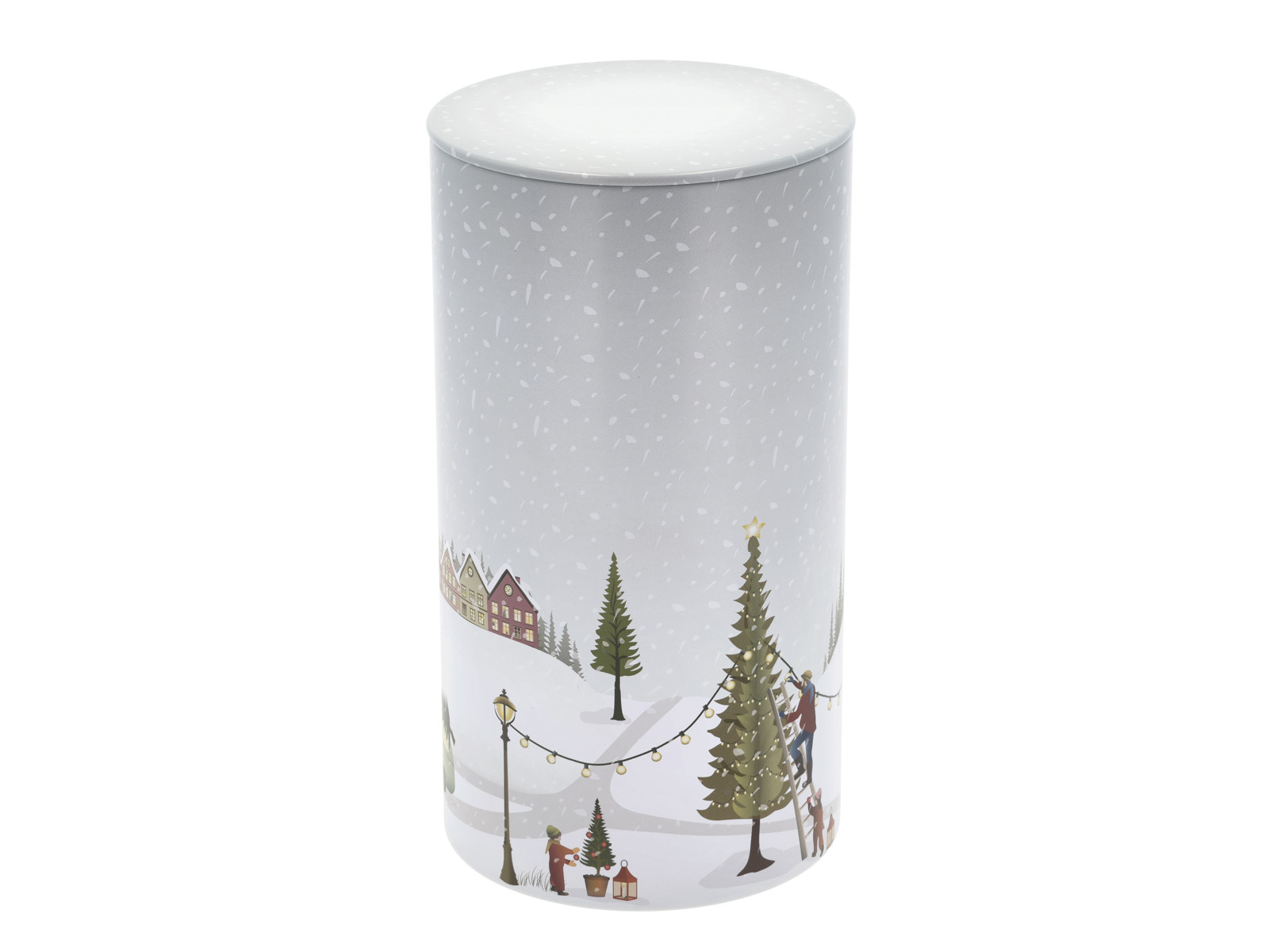 Kagedåse af metal med eventyrlige vintermotiver. Serien Vinter er skabt i samarbejde med designer Dorthe Mathiesen. Hendes motiver med den karakteristiske grafiske streg og lyse, nordiske pastelfarver afspejler stemningen i de hyggelige vintermåneder og fortæller historier fra de små samfund om leg i sneen, stemningsfulde vinterlandskaber og samvær med familie og venner, som beskueren kan hoppe ind i og selv bygge videre på.