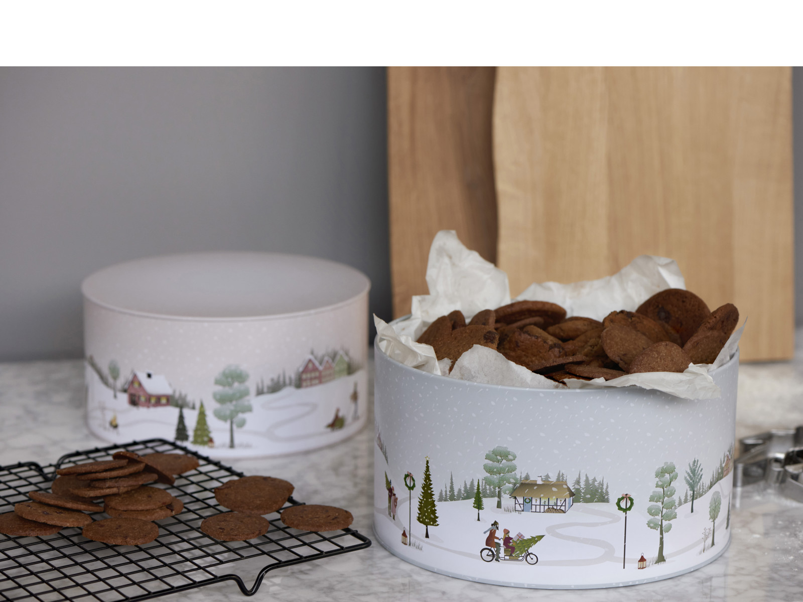 Kagedåsesættet med de skønne illustrationer, som går igen på Pillivuyts hyggelige Vinter stel, består af to fine metaldåser. Den store dåse, dia. 22 cm, H 12 cm, har farven Arctic Ice, og indeni ligger en mindre dåse, dia. 20 cm, H 10 cm, i farven Woodrose.