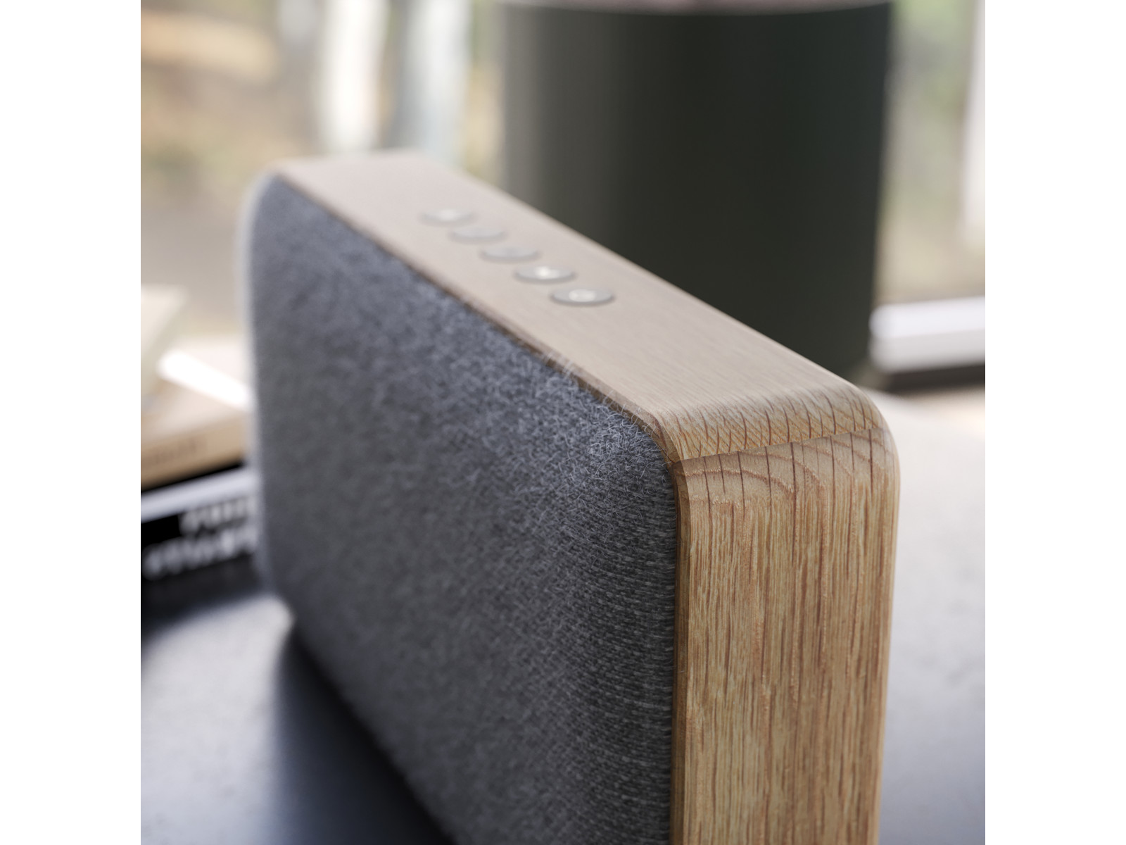 Move Wood skaber en stilren symmetri mellem lyd og design. Det smukke trækabinet i massiv eg, tekstil fra KVADRAT, fantastisk lyd og op til 12 timers streaming udgør denne kompromisløse Bluetooth højtaler, som giver lige så stor nydelse, når den blot står fremme, som den gør, når den afspiller ens yndlingsmusik. En nydelse man let kan tage mig sig på farten grundet det smart design.
