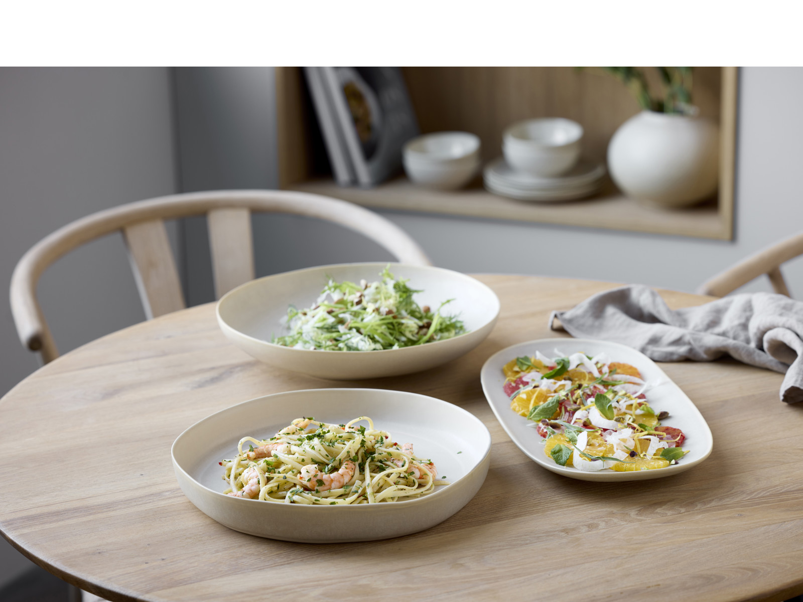 Det smukke serveringssæt indeholder en salatskål, dia. 28 cm, og to serveringsfade, et ovalt på 34 x 18 cm og et rundt fad med høj kant i diameter 28 cm. Soft beige.