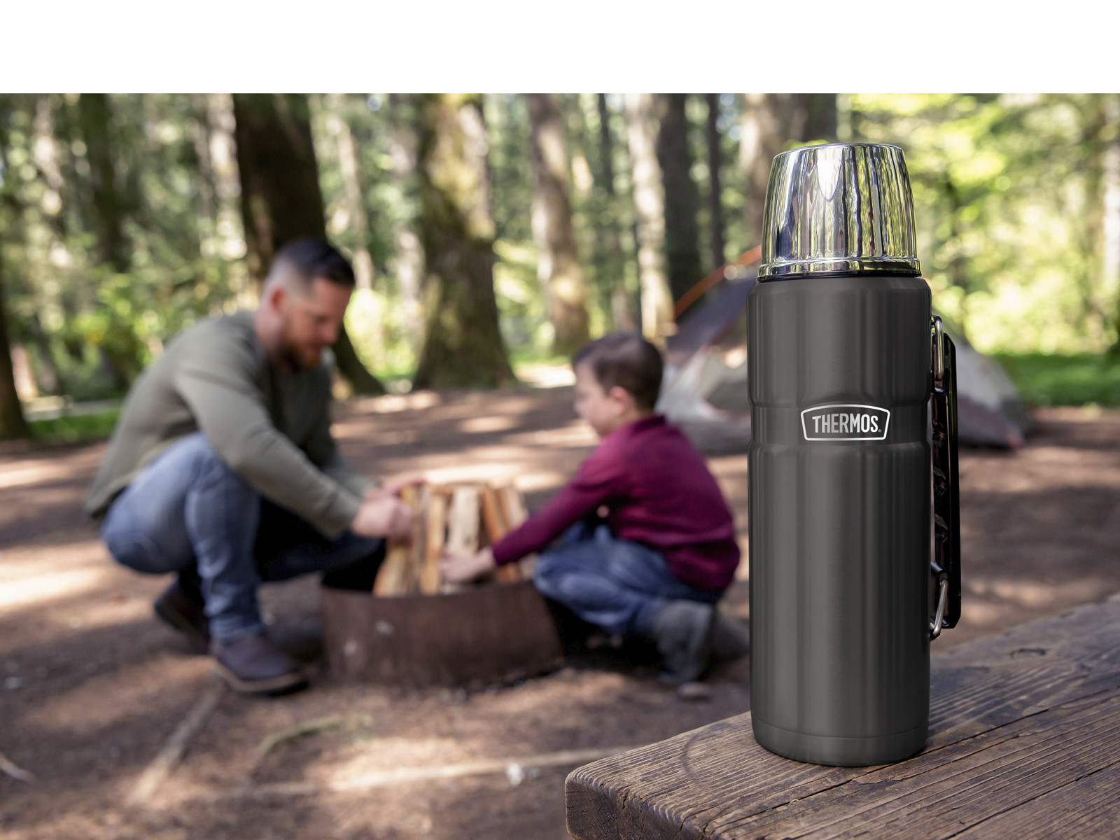 Thermos Stainless King 1,2 liter termoflaske i rustfrit stål med hank. Låget kan bruges som kop, og flasken er velegnet til både kolde og varme drikke. Vi anbefaler at forvarme flasken med varmt vand fra hanen, inden den fyldes med den ønskede drik.