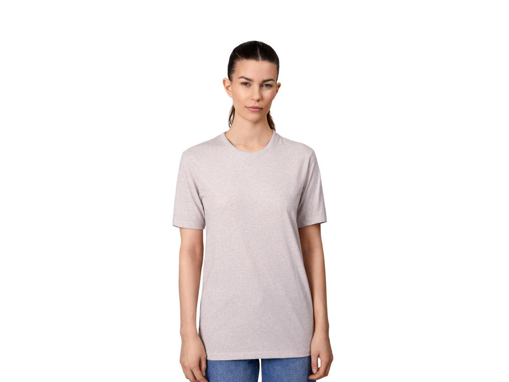 Tidløs T-shirt fremstillet af garn indeholdende 20% fber lavet af genanvendt tekstilafald fra husstande i hele Danmark. Det multifarvede tekstilafald kommer afdæmpet frem i det melerede udtryk. T-shirten er ikke indfarvet og har rund hals, fre-lags halsrib samt forstærkning med nakke- og skulderbånd