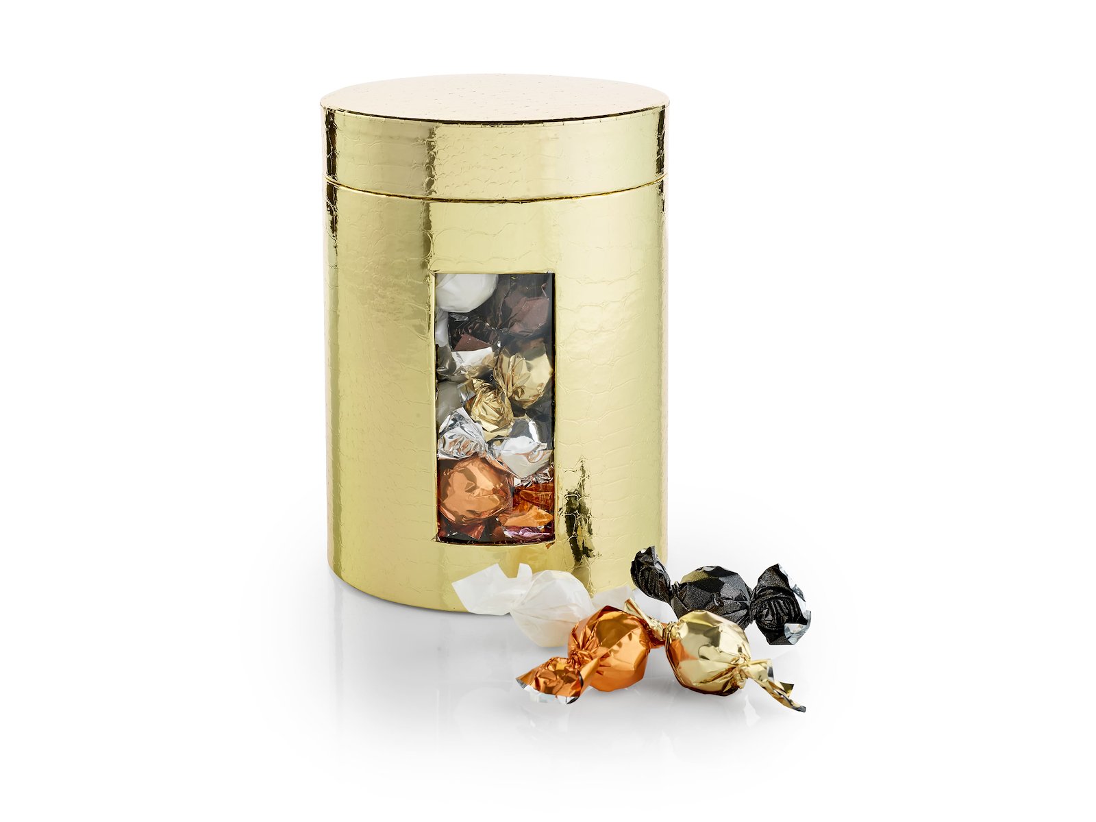Guld rund hatteæske m/vindue m/1000 g. Chokoladekugler
