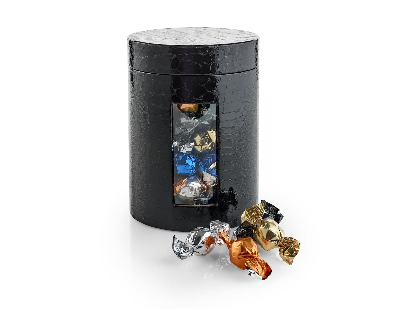 Sort rund hatteæske m/vindue m/1000 g. Chokoladekugler