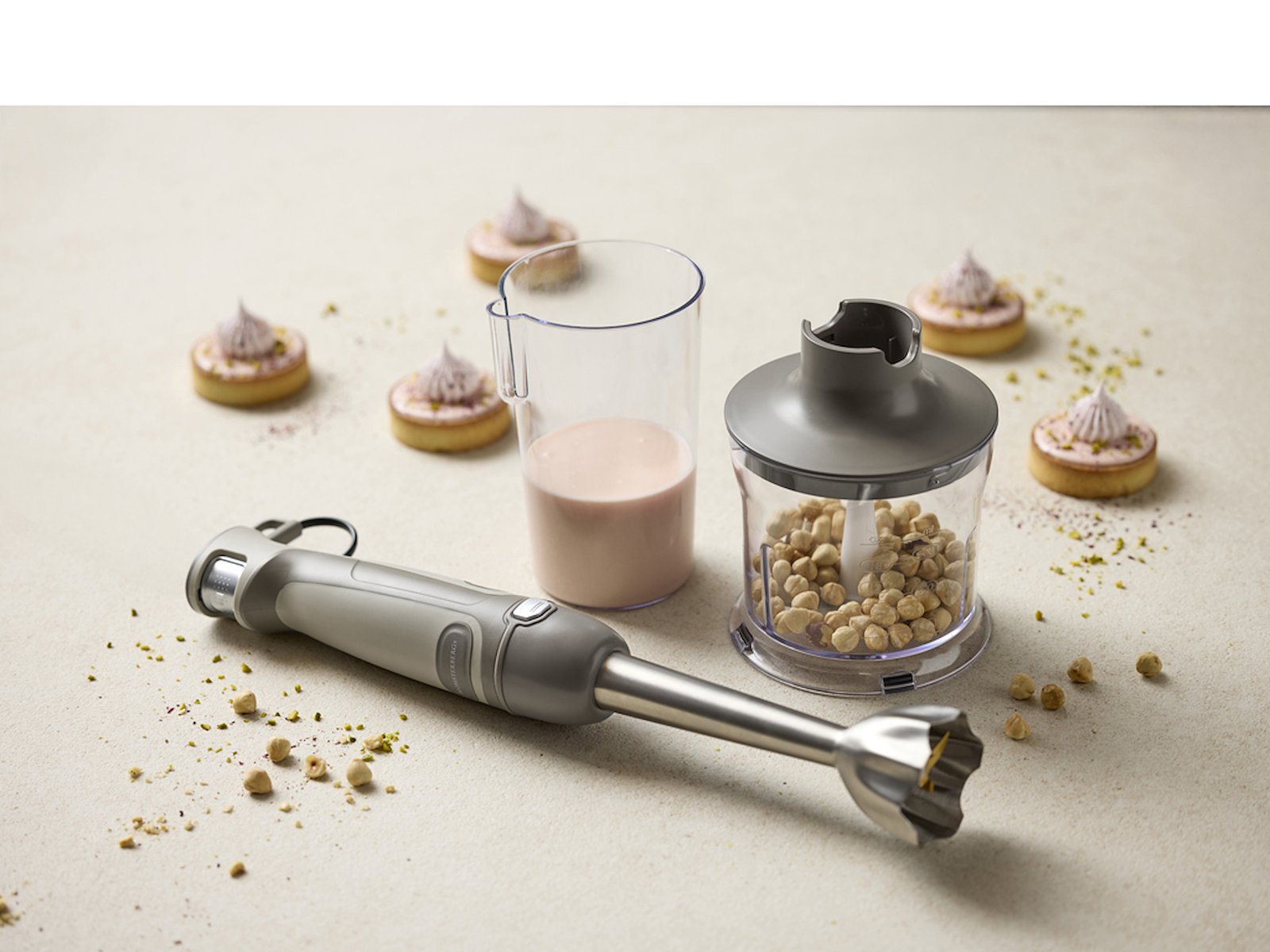 Stavblendersæt til både små og store køkkenopgaver. Stavblenderen har glidende hastighedsjustering og lader dig styre tempoet med én knap. Sættet indeholder en 500 ml minihakker, der hurtigt klarer nødder, krydderurter og grøntsager samt et 600 ml målebæger, som er perfekt til at måle ingredienser eller blande mindre portioner direkte i bægeret. Kort og godt: • Glidende hastighedsjustering – styr tempoet præcist med én knap • 500 ml minihakker – klarer nemt nødder, krydderurter og grøntsager • 600 ml målebæger – til både måling og tilberedning af små portioner