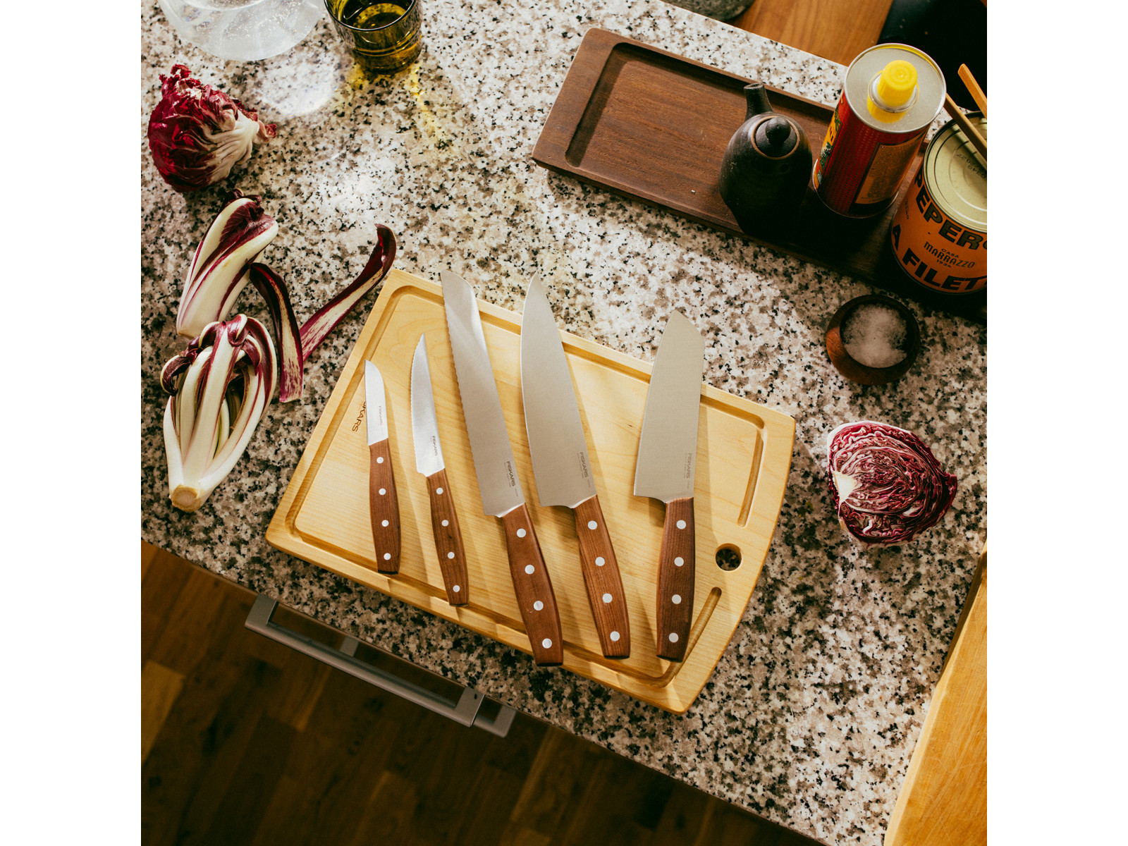 Folken knivserien er produceret i klassiske materialer, inspireret af den danske knivtradition. Knivblad er i tysk rustfrit stål af høj kvalitet HRC 55, og Knivhåndtag i varmebehandlet FSC ahorntræ. Skal vaskes i håneden