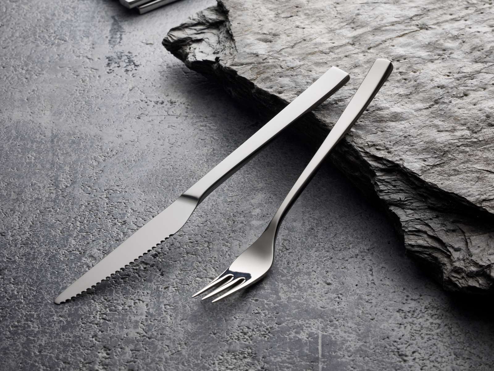 Gense Fuga har et klassisk design med blødt afrundede linjer, der hviler behageligt i hånden, og en raffineret kontrast i de matte skafter og blankpolerede hoveder. Tias Eckhoff formgav i 1962 det ikoniske bestik, der i sit design formidler klarhed og præcision, men med et subtilt udtryk.