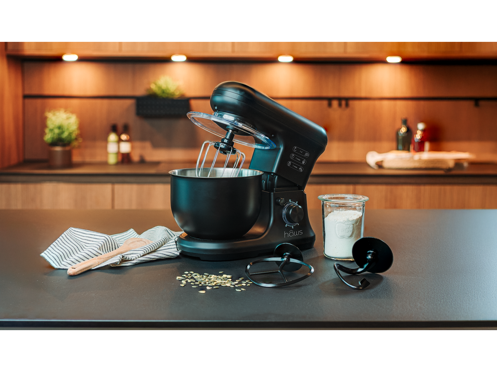 Gør madlavningen både nemmere og mere elegant med Hâwskøkkenmaskine i et tidløst matsort design. Med en kraftfuldmotor på hele 1200W klarer den nemt både at røre, piske ogælte – uanset om du bager brød, laver flødeskum eller røreren dej.Maskinen har 6 justerbare hastigheder, så du altid har fuldkontrol over processen og kan tilpasse den præcist til dineingredienser. Den gennemtænkte konstruktion gør den ekstrabrugervenlig – blandt andet med et praktisk plastlåg medpåfyldningshul, så du nemt kan tilføje ingredienser undervejsuden at stoppe maskinen.Hâws køkkenmaskinen er den ideelle hjælper i ethvert modernekøkken – funktionel, kraftfuld og designet til hverdagsbrug