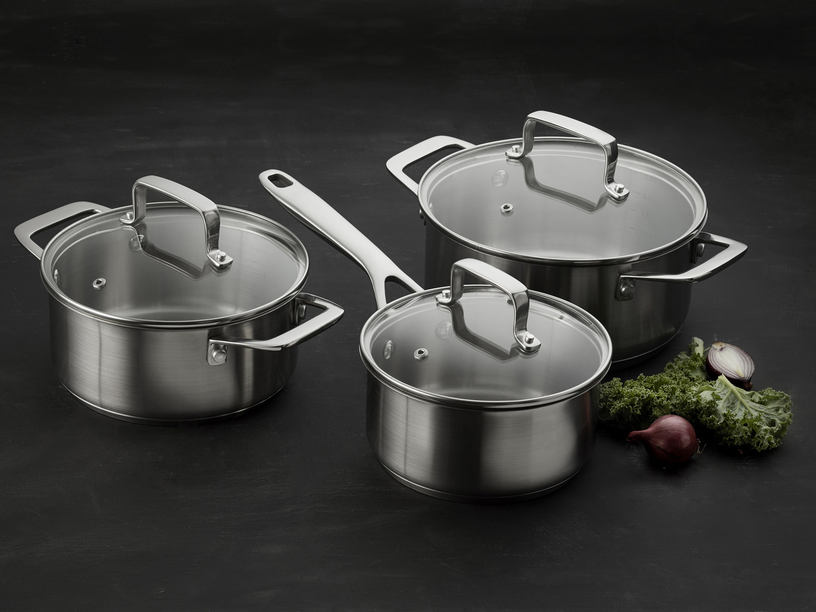 Grydesæt med låg, 6 dele. 79NORD-gryderne er fremstillet i 18/8 rustfrit stål med en bundtykkelse på 4,5 mm og har glaslåg med damphul. 1,3 l kasserolle m. låg, 16 cm 1,7 l gryde m. låg, 18 cm 2,4 l gryde m. låg, 20 cm