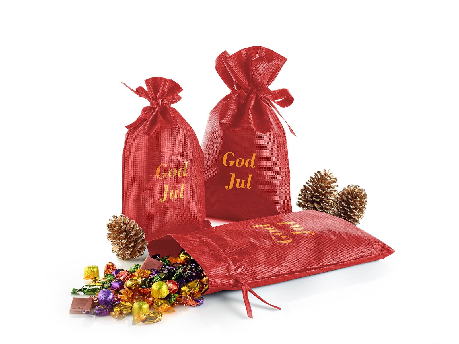 Rød stofpose - guldtryk "God Jul" m/2900 g. Cocktailmix; Mulighed for Private Label