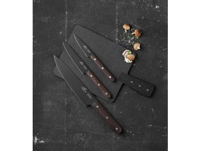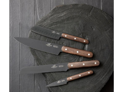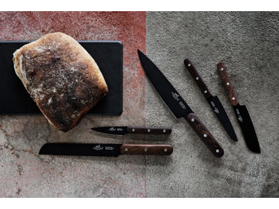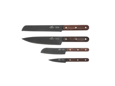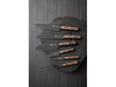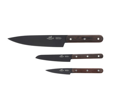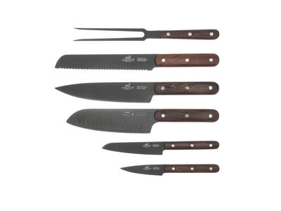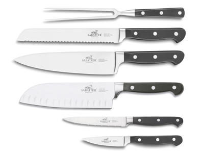 #Lion Sabatier Knivsæt 6 dele, urte, tomat, santoku, brød og kokkekniv samt stegegaffel i stål/sort, Pluton