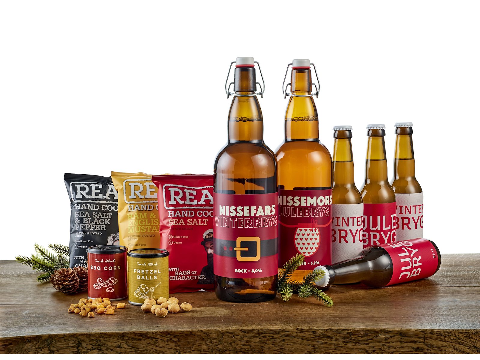 1 fl. Nissefars Vinterbryg, Barley Beer 100 cl.; 1 fl. Nissemors Julebryg, Lager Beer 100 cl.;2 fl. Julebryg 2x33 cl.; 2 fl. Vinterbryg 2x33 cl.; 3 ps. REAL chips 3x35 g.; Snack Attack - BBQ Corn 35 g.; Snack Attack - Pretzel Balls 25 g.; Pakket i kartonæske m/træuld