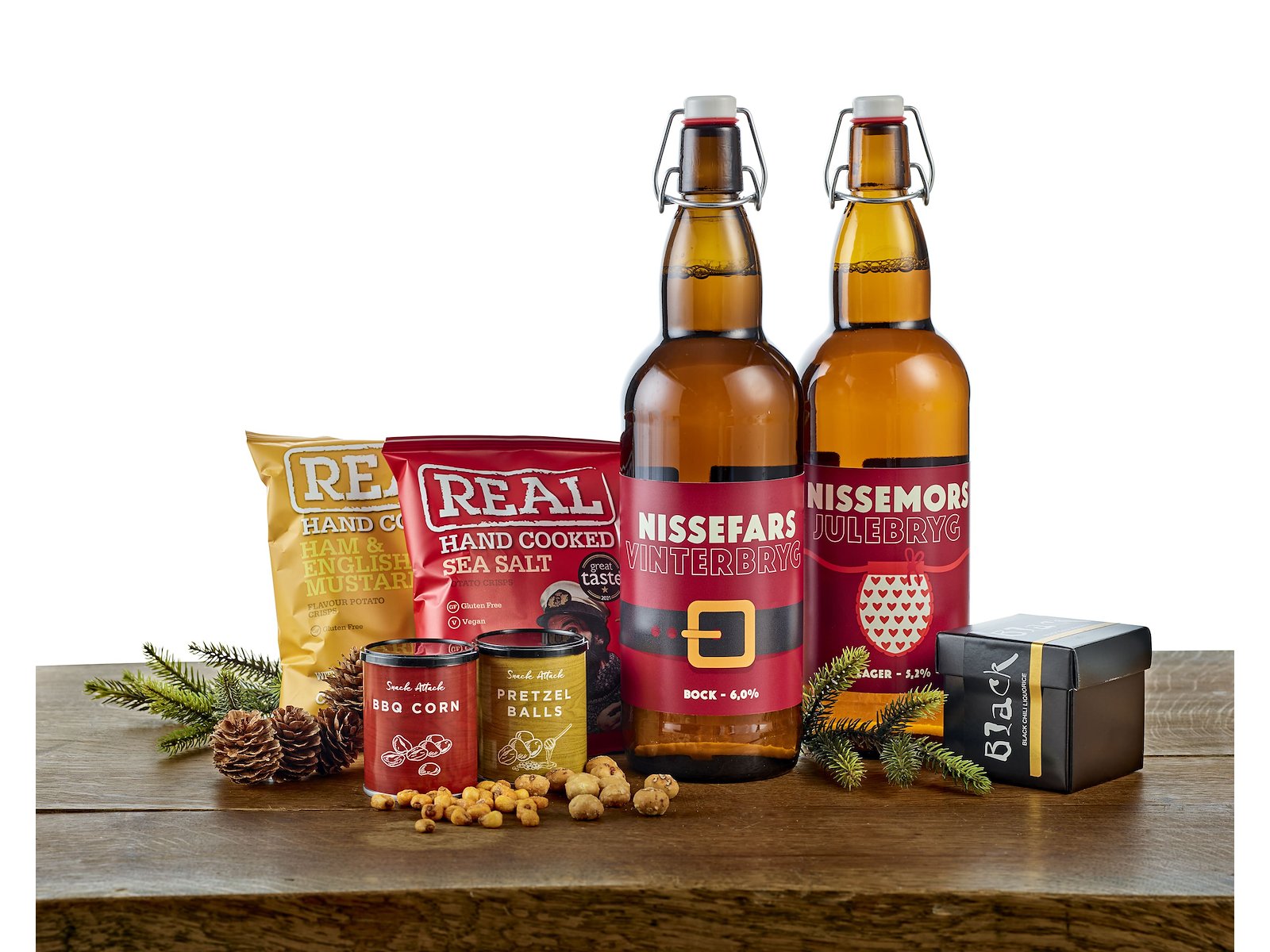 1 fl. Nissefars Vinterbryg, Barley Beer 100 cl.; 1 fl. Nissemors Julebryg, Lager Beer 100 cl.; 2 ps. REAL chips 2x35 g.; Snack Attack - BBQ Corn 35 g.; Snack Attack - Pretzel Balls 25 g.; Black Lakrids - Chili 90 g.; Pakket i rød stofpose