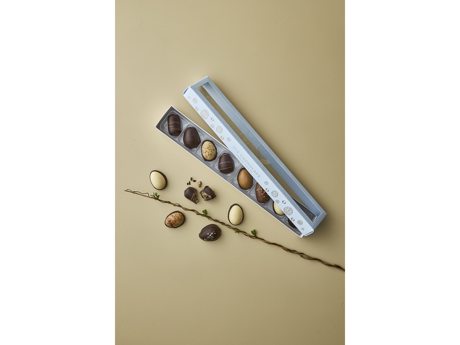 Gaveæsken indeholder 8 mesteræg af 8 forskellige smagsvarianter.