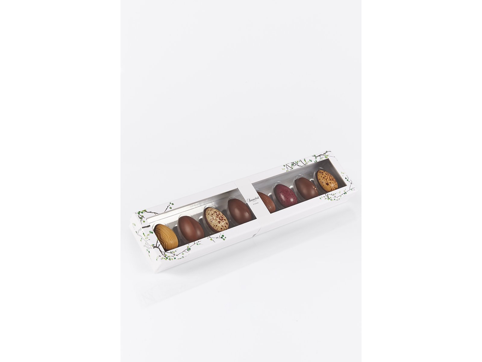 Vores økologiske påskeæg hylder både klassiske smage og moderne gastronomi. Naturens råvarer og det klassiske håndværk er inspirationskilde til et univers, hvor alle sanser bliver bragt i spil. Æsken indeholder 8 forskellige varianter af vores raffinerede påskeæg i form af bl.a. marcipan af stenvalsede middelhavsmandler, praliné, karamel og orangeblomst.