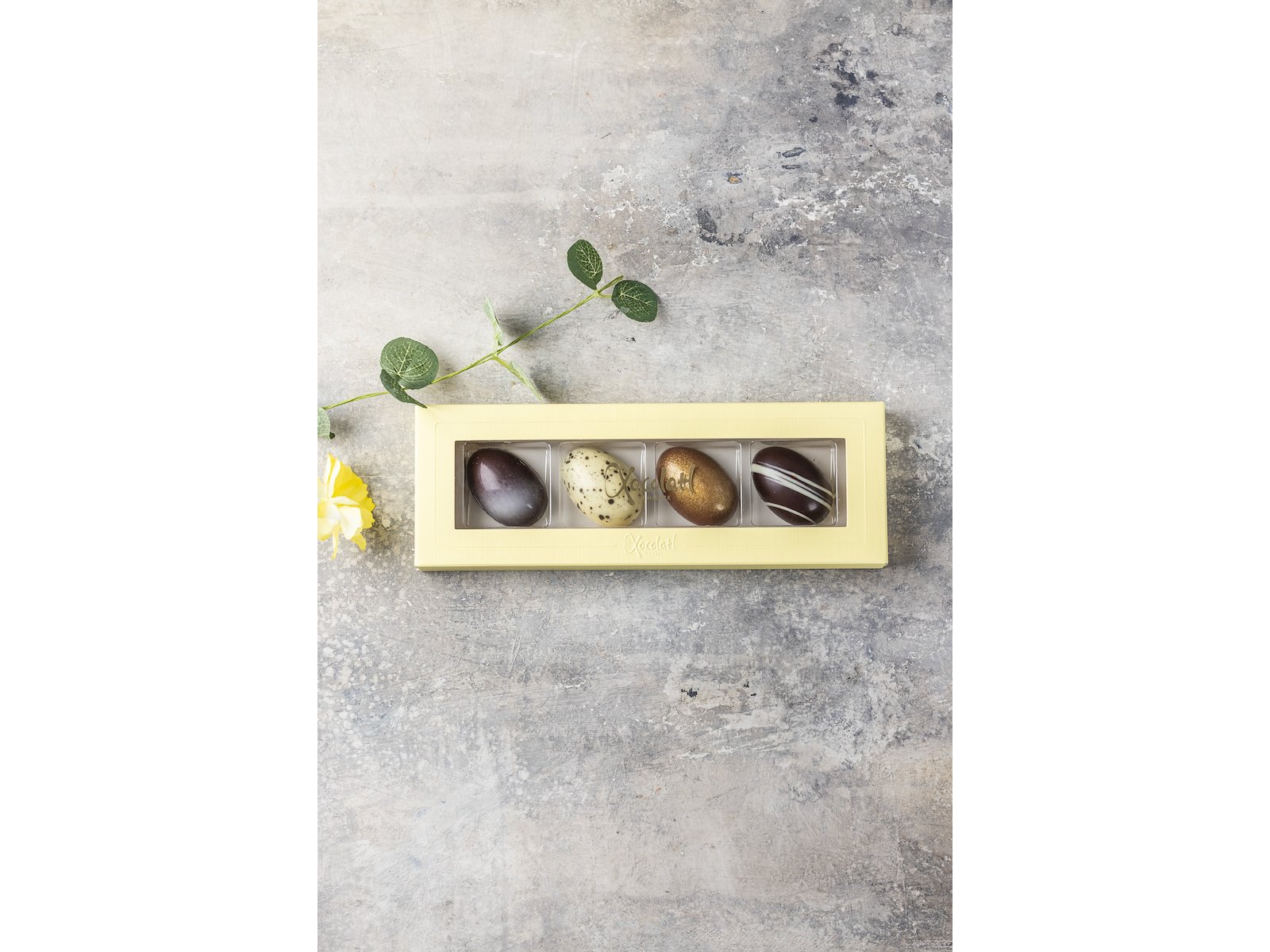4 fyldte chokolader med flødekaramel, mintkaramel, lakrids og saltkaramel