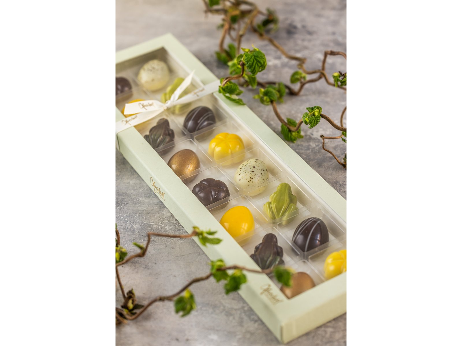 Grøn gaveæske med 16 fyldte chokolader. Skønne smagsvarianter som lakrids, yuzu, flødekaramel, citrusmix, saltkaramel, mint og marcipan