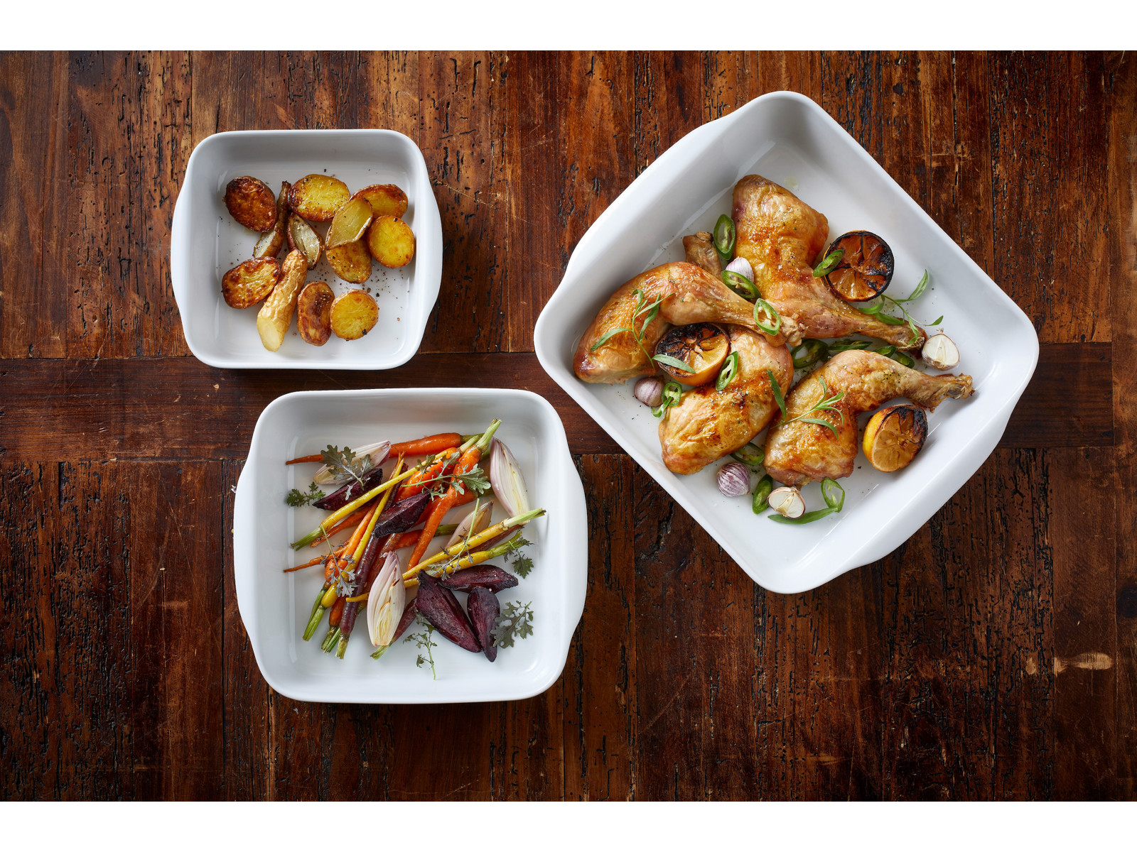 Sæt med kvadratiske fade på 17 x 17 cm, 22 x 22 cm og 27 x 27 cm med håndtag til ovnretter og til servering.