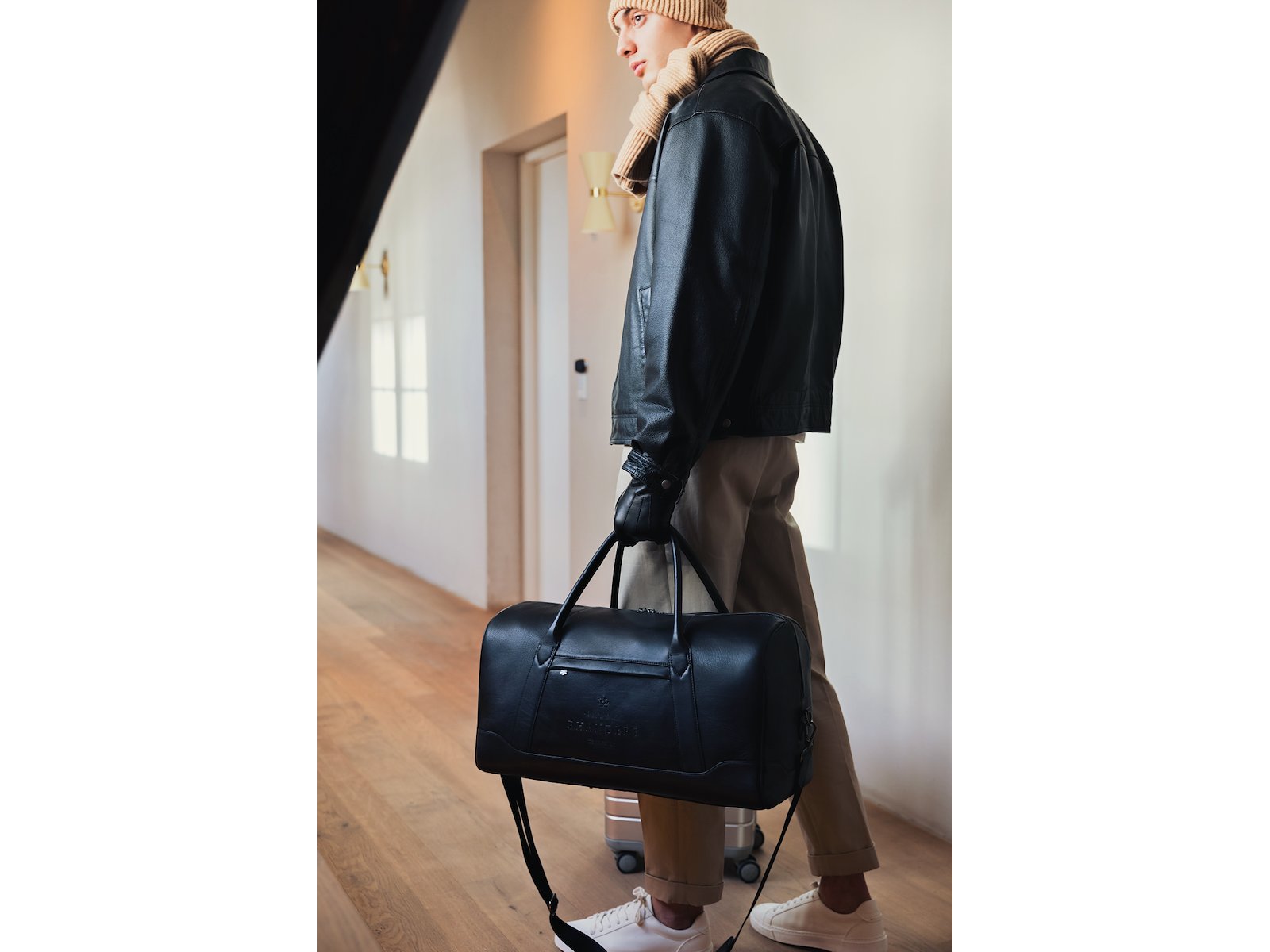 Den store taske har et rummeligt rum til tøj og sko, mindre lommer til organisering samt lynlåslommer både indvendigt og udvendigt.Som prikken over i'et har den et rundt håndtag af smørblødt handskeskind, en praktisk trolley strop og en bred skulderrem.