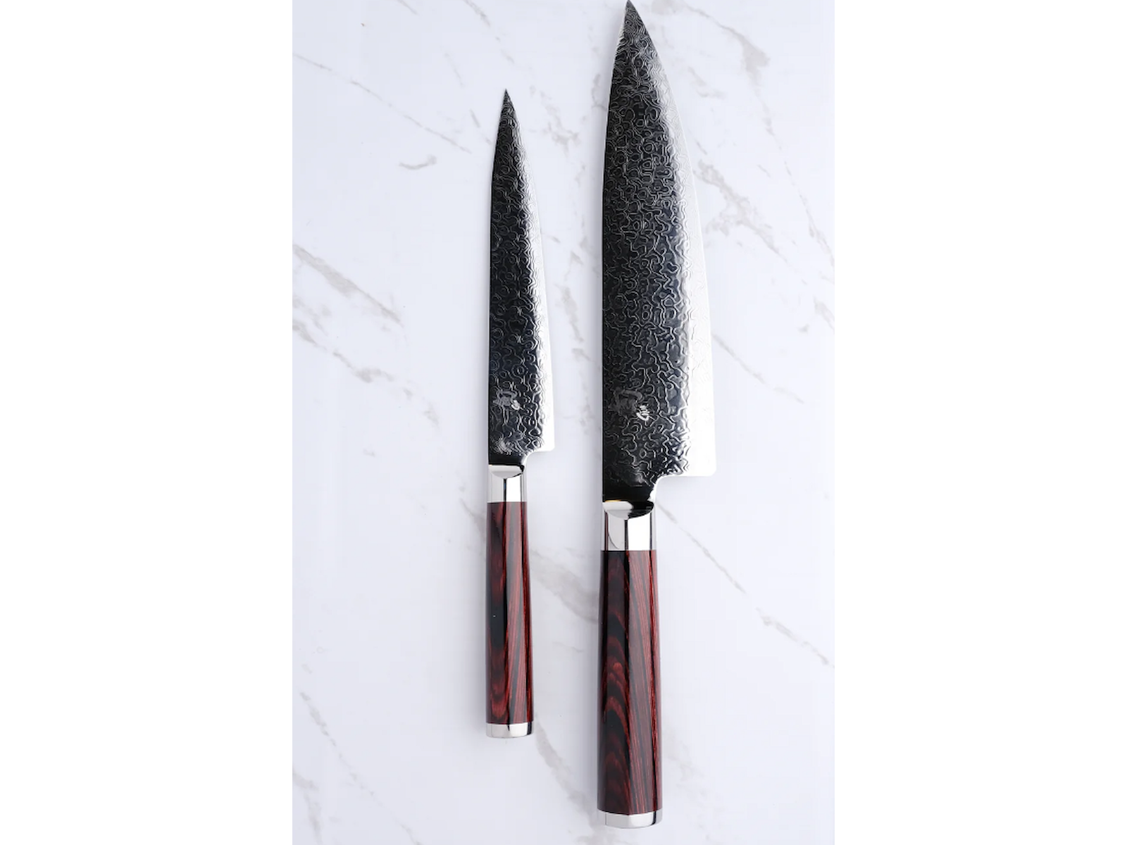 Dette luksuriøse samlersæt består af en førsteklasses kokkekniv og en alsidig universalkniv. Disse ekstraordinære knive, med deres unikke dobbeltkernede klinger og mørkårede håndtag i rød og sort, leveres i en eksklusiv aluminiumsæske til sikker opbevaring og transport.